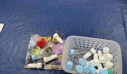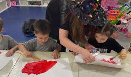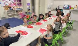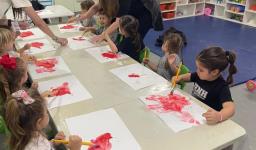 Após esse momento, Lúcia realizou uma experiência com as crianças, eles fizeram uma “poção do amor” utilizando ingredientes como bicarbonato de sódio, vinagre e tinta guache vermelha. A exploração foi realizada com pincel em folha.