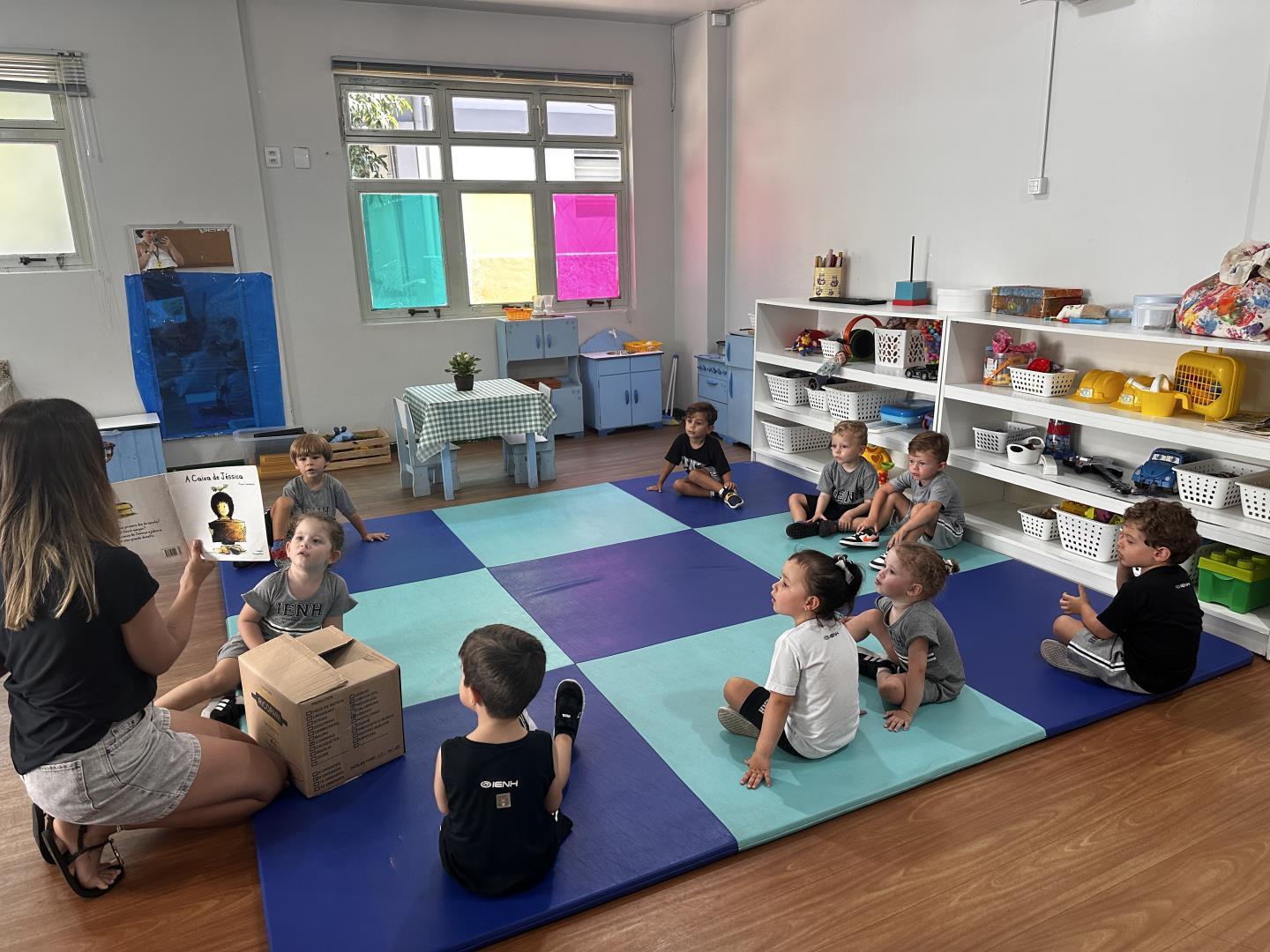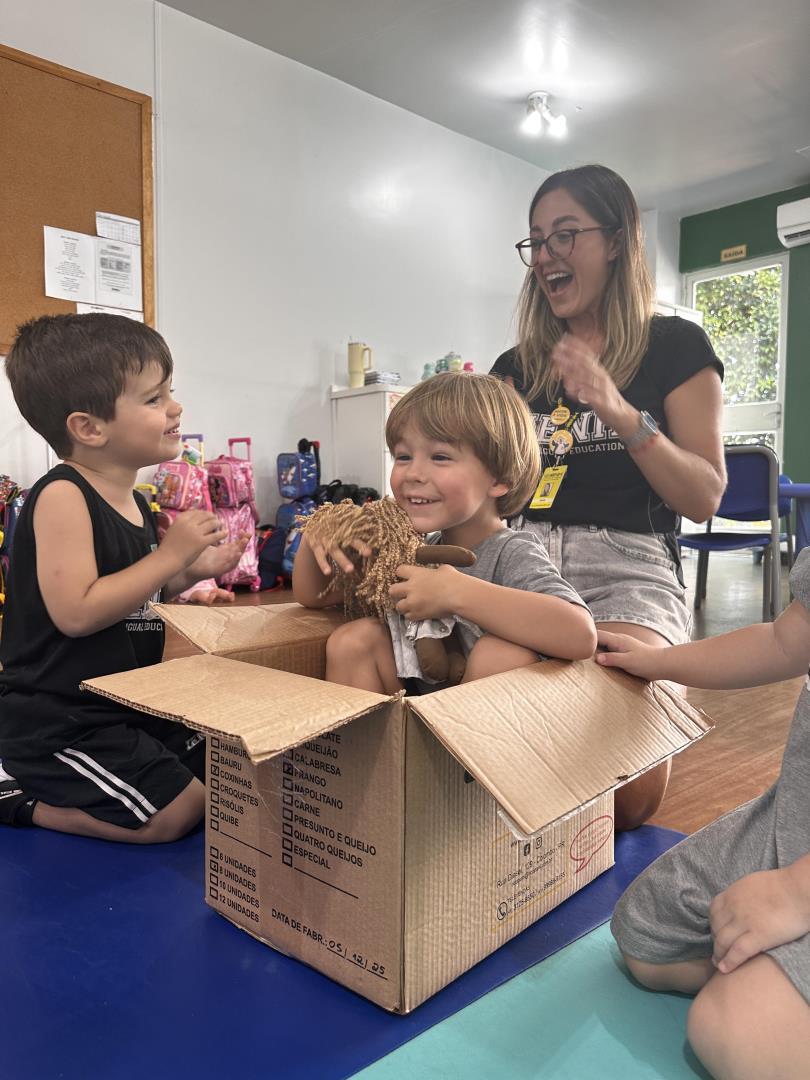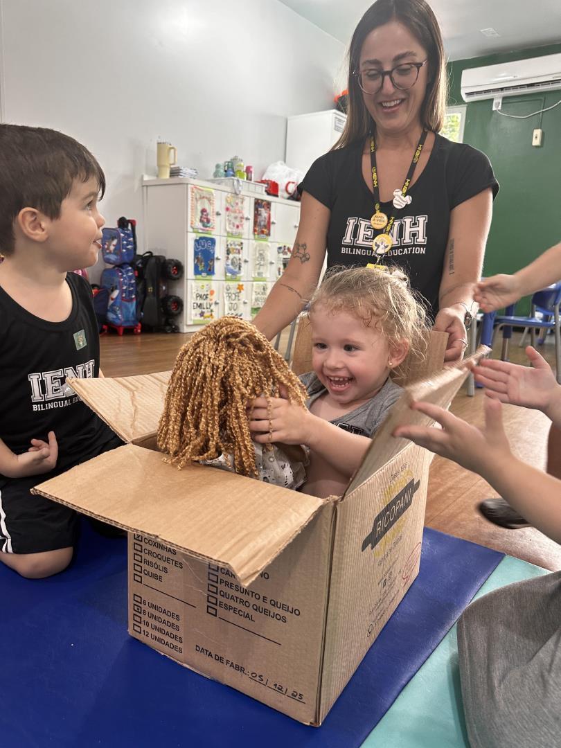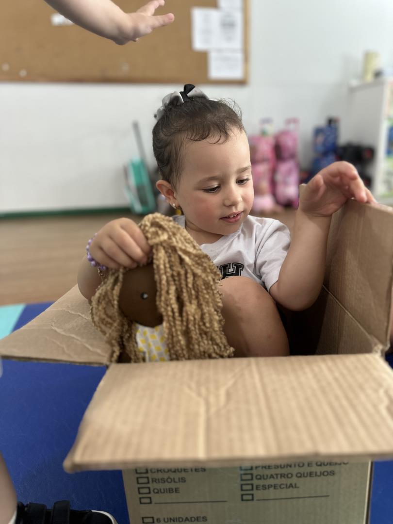 No dia seguinte, a experiência continuou de forma ainda mais interativa. Uma grande caixa de papelão, semelhante à utilizada pela personagem na história, foi levada para a turma. Dentro dela estava uma boneca representando Jéssica, que “apareceu” para convidar os colegas a brincar de se esconder, assim como acontece no final do livro. “As crianças participaram com entusiasmo e aproveitaram o momento de brincadeira e imaginação”, acrescenta a professora Joana Machado.