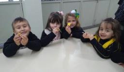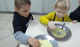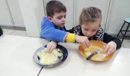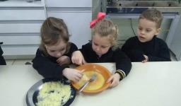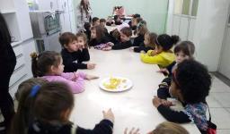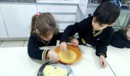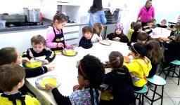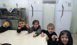 Depois de utilizarem o chá e o leite trazidos da visita ao Sítio Recanto do Vovô, os alunos dos Níveis 4 da Educação infantil da IENH – Unidade Oswaldo Cruz preparam uma receita com os ovos que receberam.