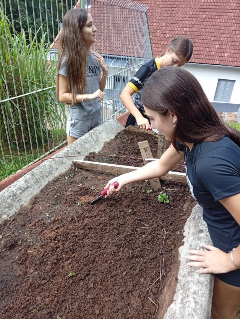 Na sequência, os estudantes participaram de uma atividade prática na horta da escola. Durante a vivência, colocaram a mão na terra, preparando o solo, organizando os canteiros e realizando o plantio de mudas de hortaliças. O contato direto com os ciclos naturais ampliou a percepção sobre a importância do cuidado com o solo, a água e os seres vivos envolvidos nesse processo.
