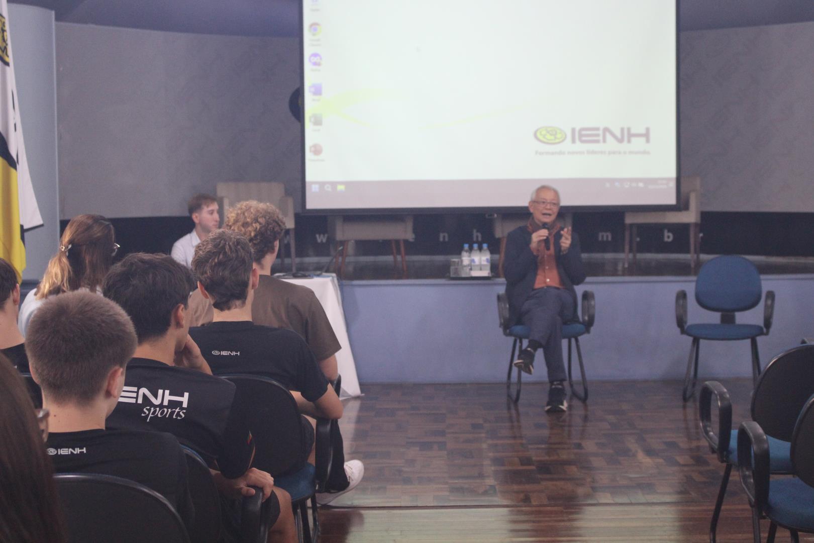 Durante o encontro, os estudantes também puderam conhecer a trajetória do ex-aluno da IENH Bernardo Leist Mosmann, que participou do intercâmbio da instituição no Canadá e, posteriormente, decidiu seguir seus estudos no país. Hoje, Bernardo se destaca por seu desempenho acadêmico, tendo conquistado bolsas de estudo e reconhecimento em sua trajetória educacional.