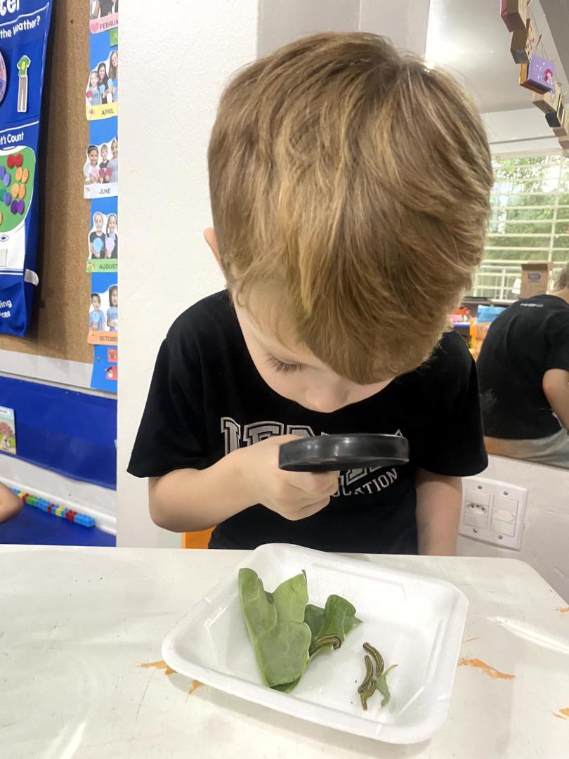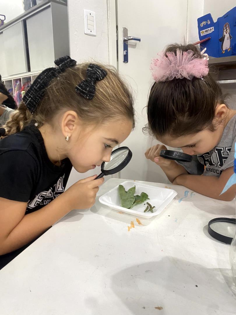 O aprendizado foi pautado pela observação direta. Equipados com lupas, os pequenos cientistas puderam examinar minuciosamente lagartas e casulos, transformando a sala de aula em um verdadeiro laboratório de biologia. Para dar significado teórico à experiência prática, a turma revisitou a história "The Very Hungry Caterpillar", conectando a literatura ao ciclo biológico observado. Esse processo culminou na aula de Learning Centers, onde os alunos confeccionaram representações artísticas de cada etapa da metamorfose, do ovo à borboleta, demonstrando domínio sobre o conceito de transformação e cuidado com a natureza.
