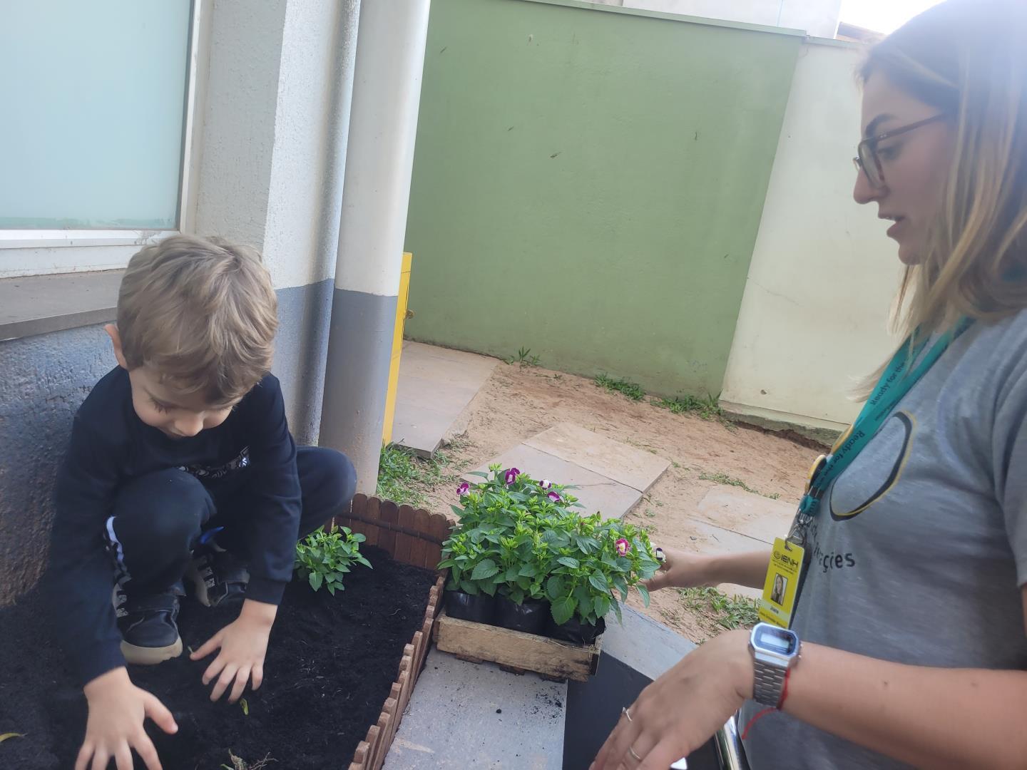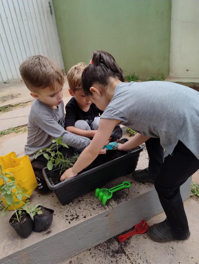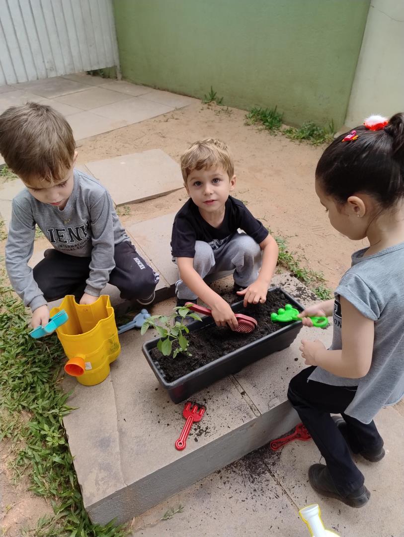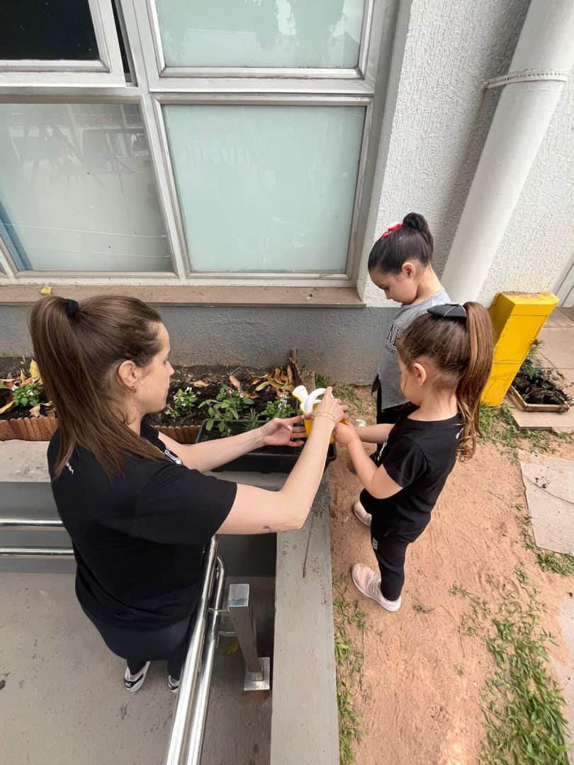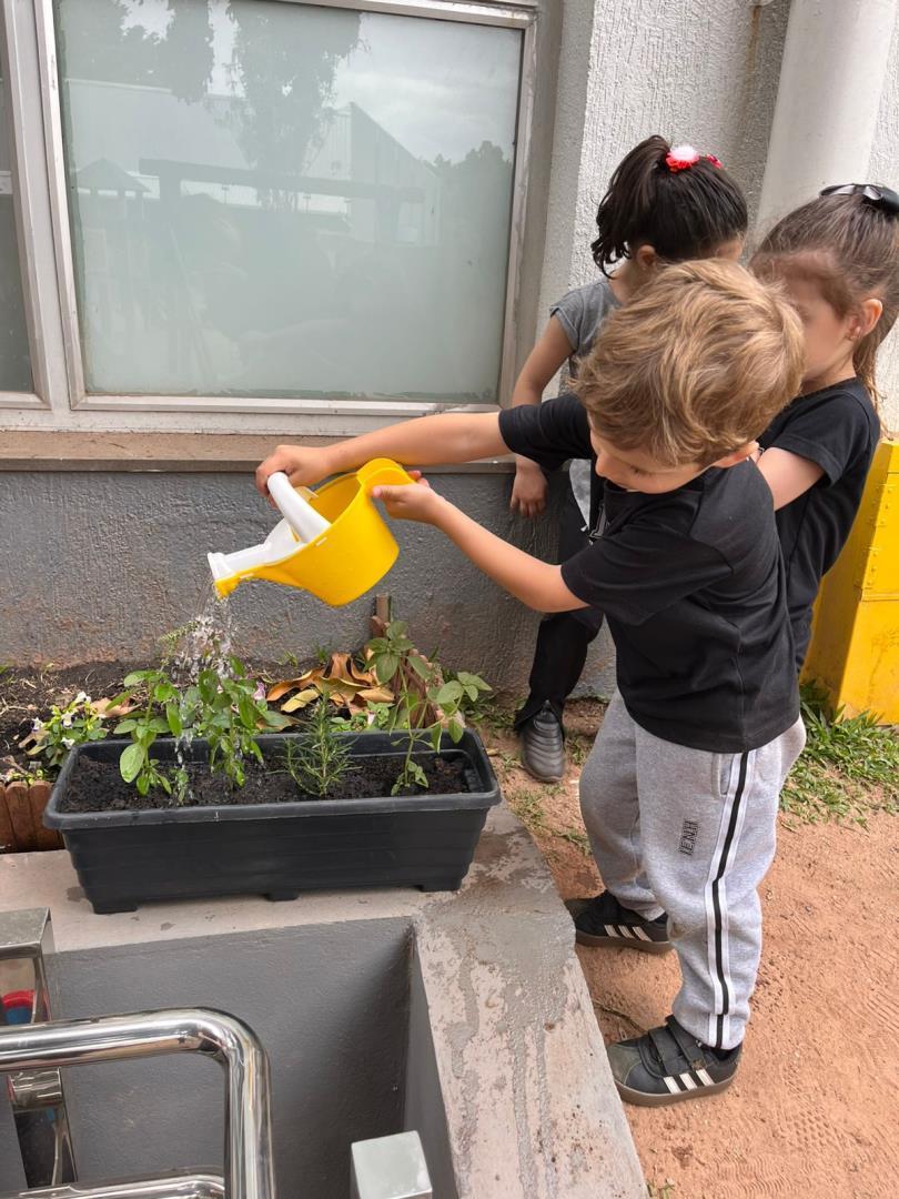 Após as observações, os pequenos decidiram plantar flores e ervas no pátio da Educação Infantil, tornando o ambiente mais colorido e agradável. O momento foi registrado em fotos e vídeos, com relatos espontâneos das crianças sobre suas descobertas e percepções.