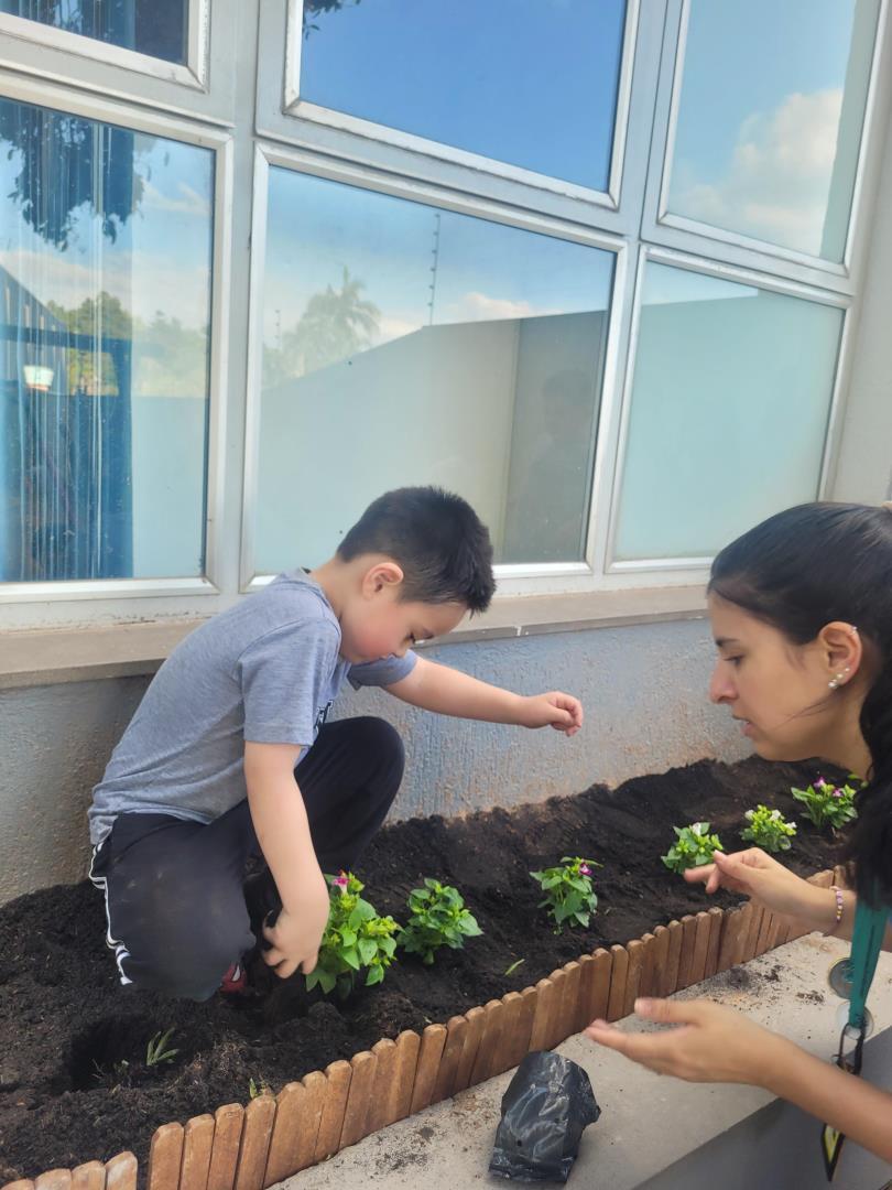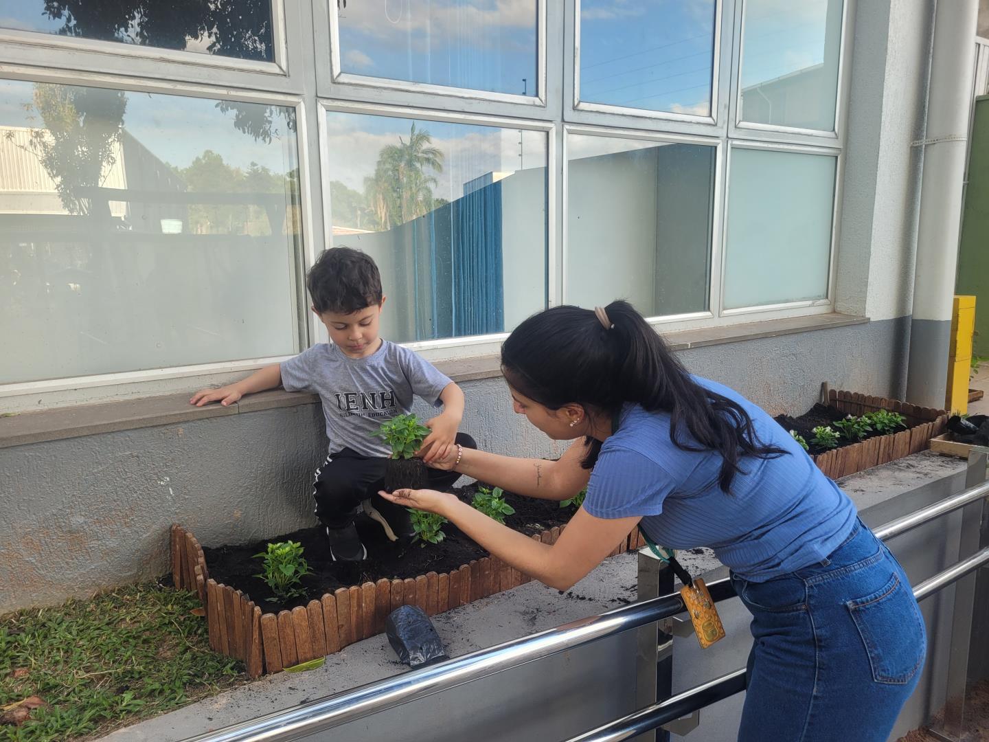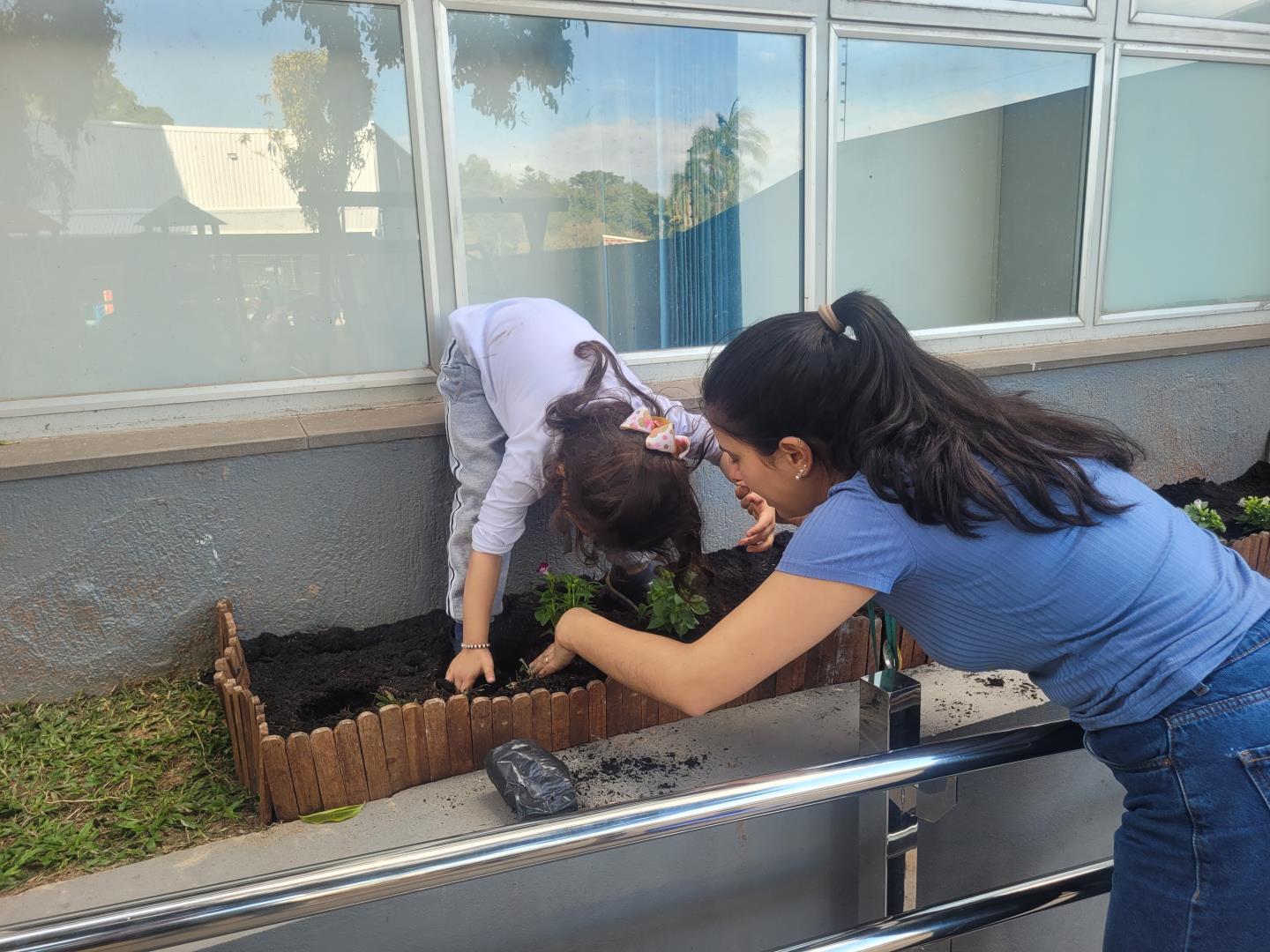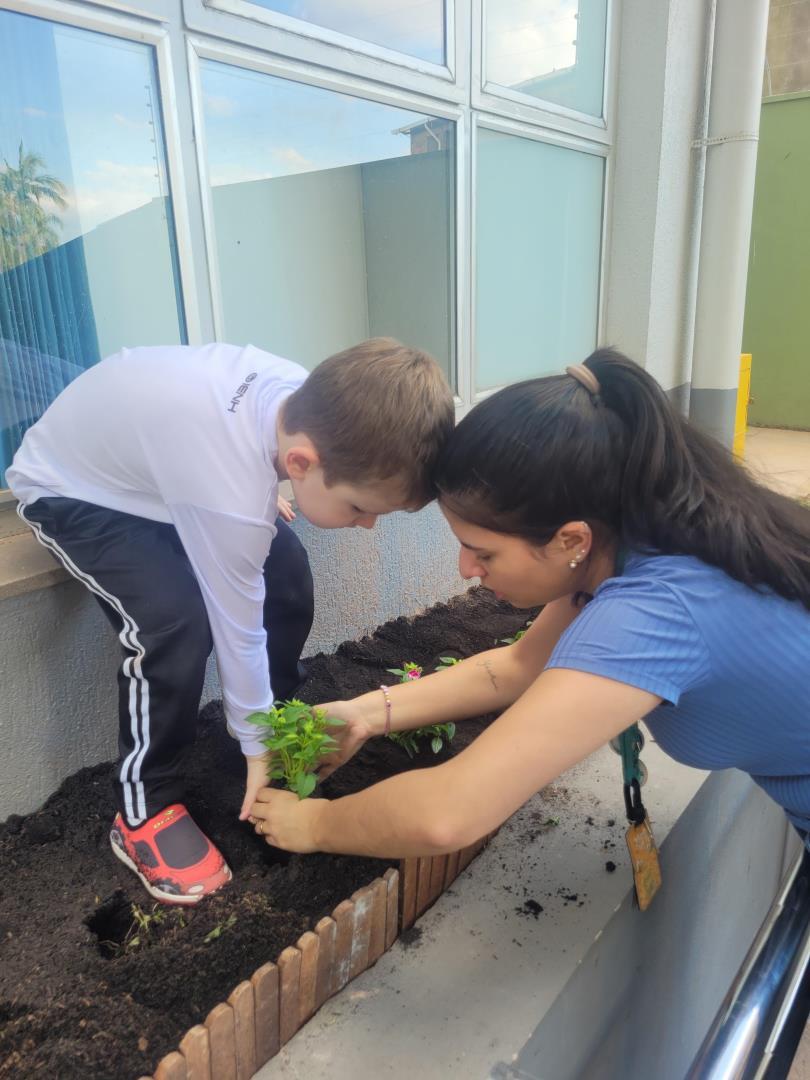 Após as observações, os pequenos decidiram plantar flores e ervas no pátio da Educação Infantil, tornando o ambiente mais colorido e agradável. O momento foi registrado em fotos e vídeos, com relatos espontâneos das crianças sobre suas descobertas e percepções.