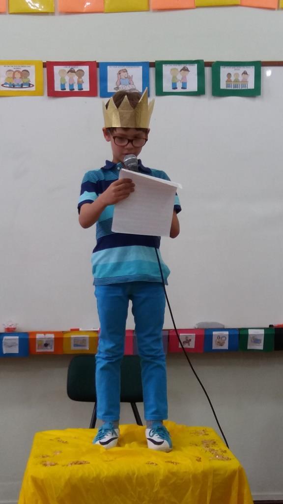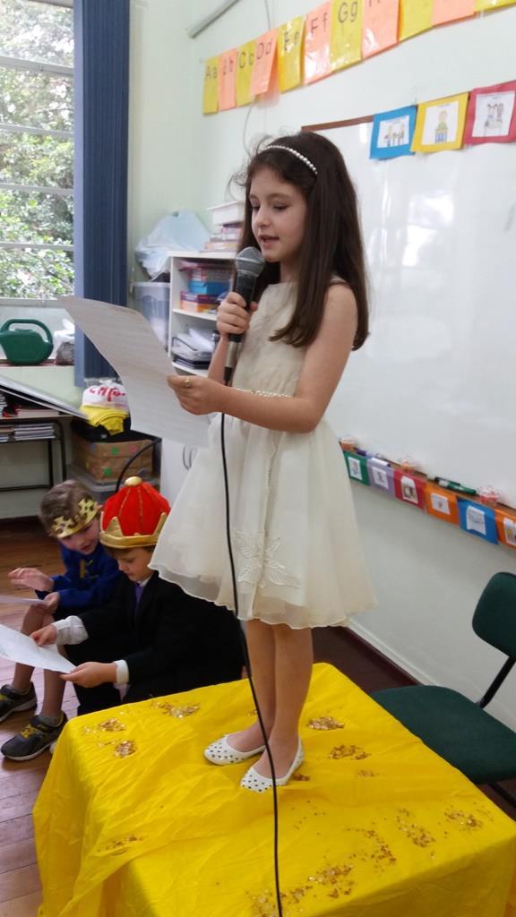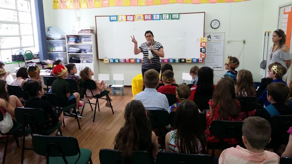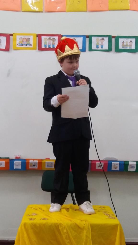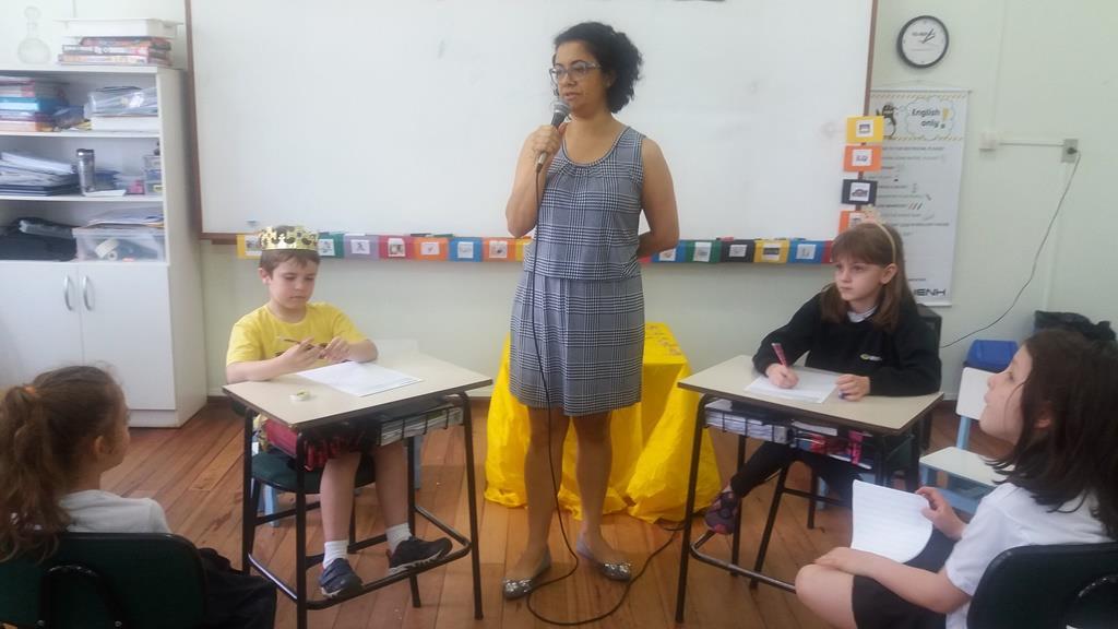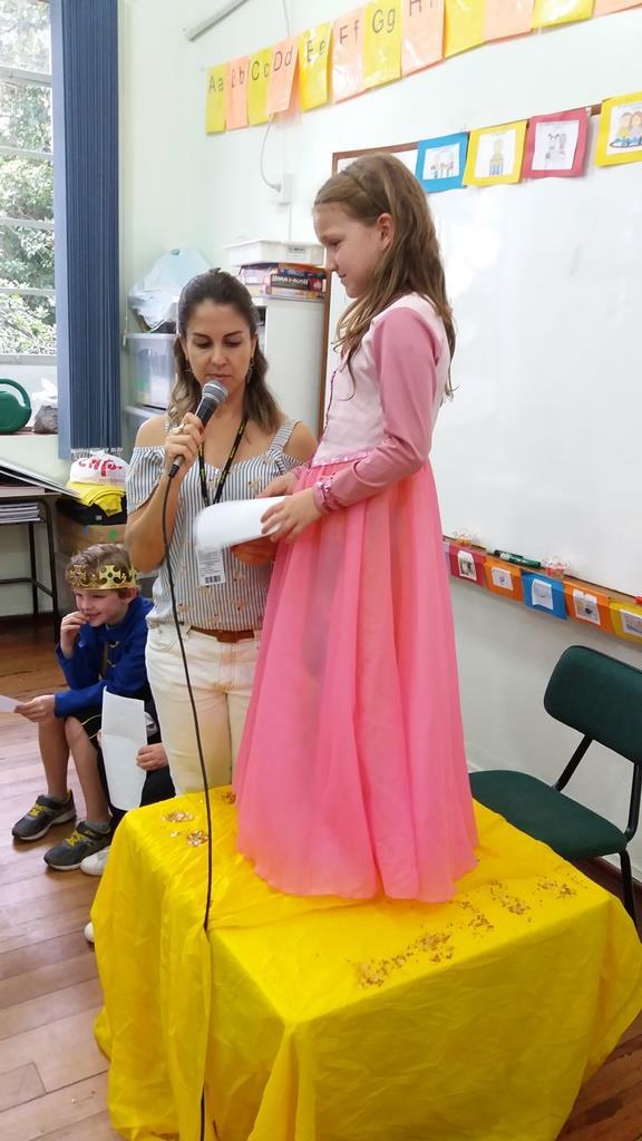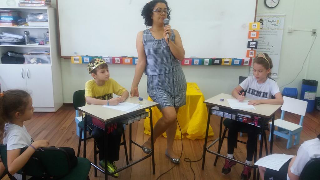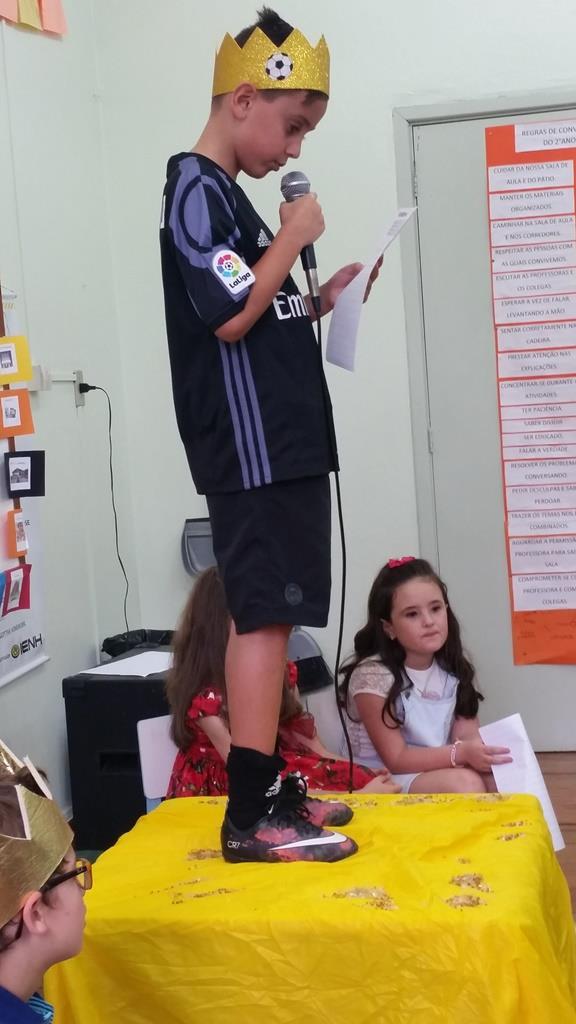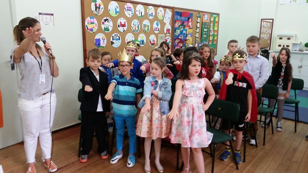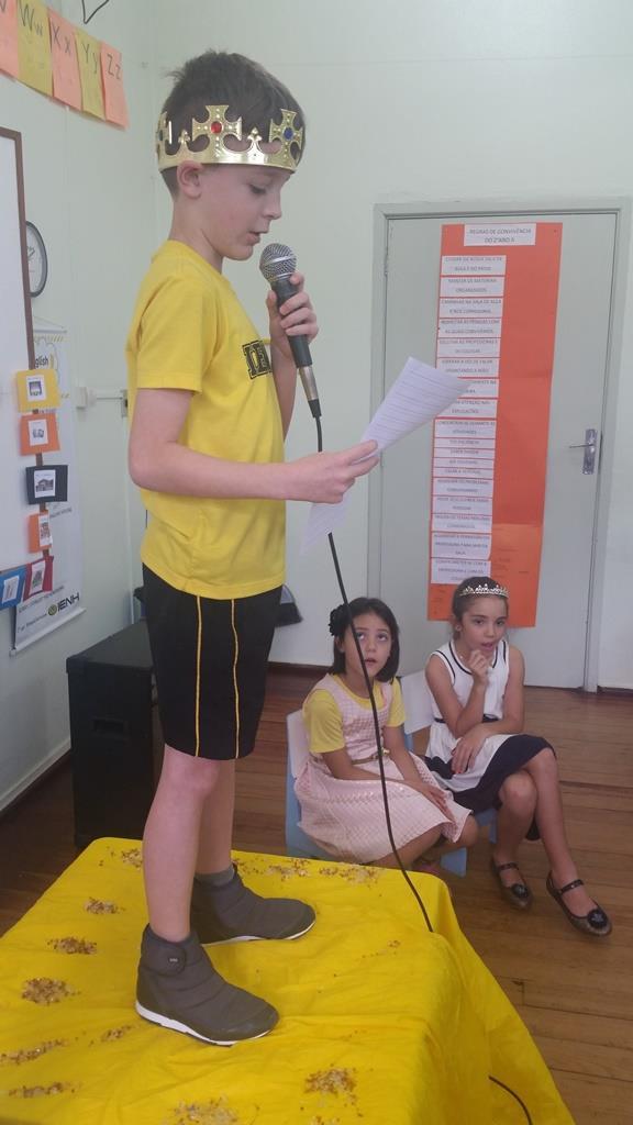 Ao final, cada aluno recebeu uma coroa que continha uma poção mágica para solucionar os problemas ambientais dos reinos: balinhas de goma! Estas foram encontradas após uma caça ao tesouro em Inglês.