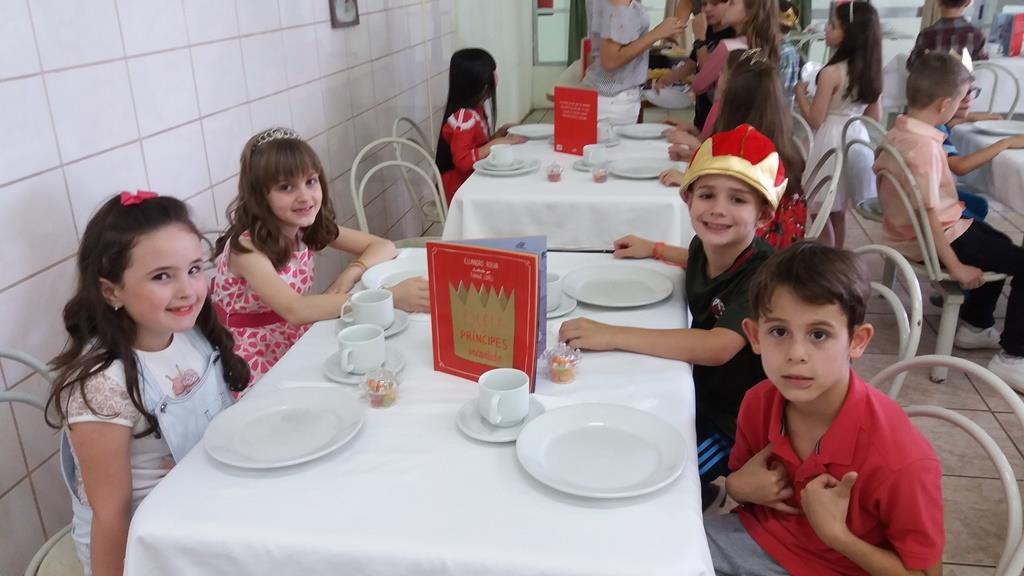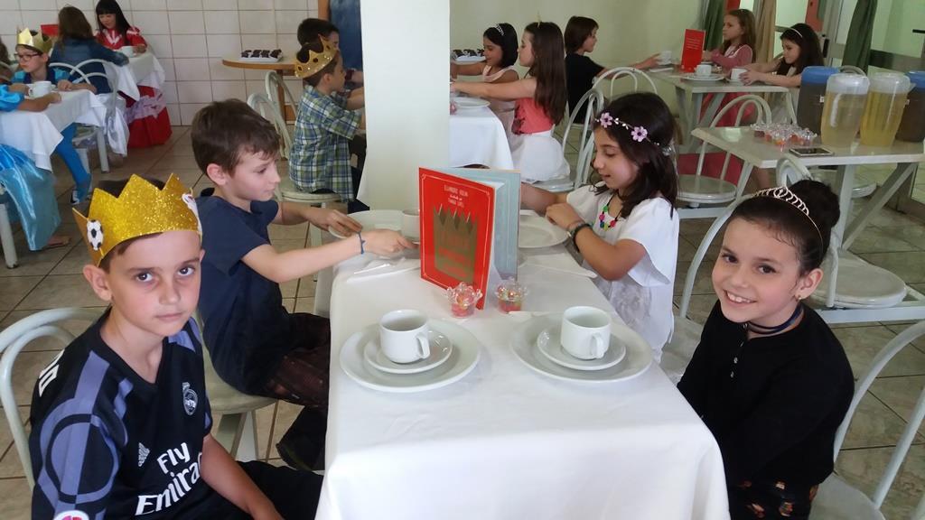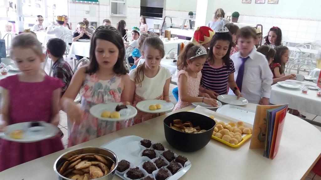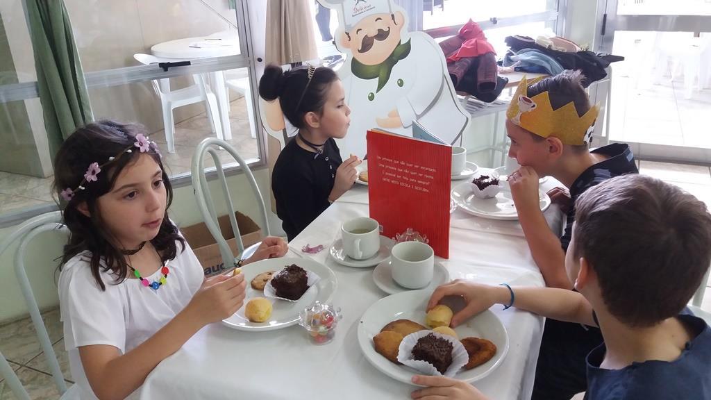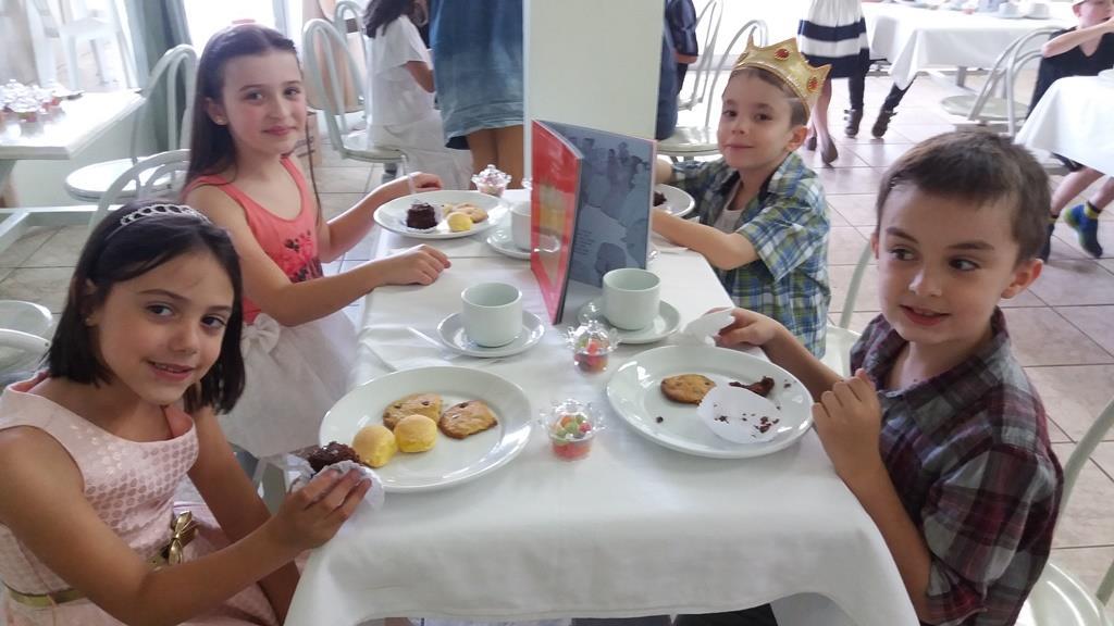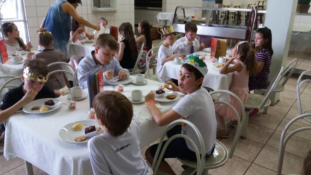 O lanche da tarde foi um delicioso chá real. Os chás foram colhidos pelos alunos diretamente da horta escolar. Também degustaram cookies que fizeram no dia anterior, bolo e pão de queijo.