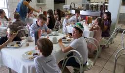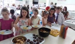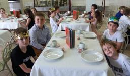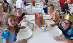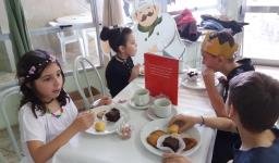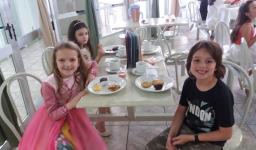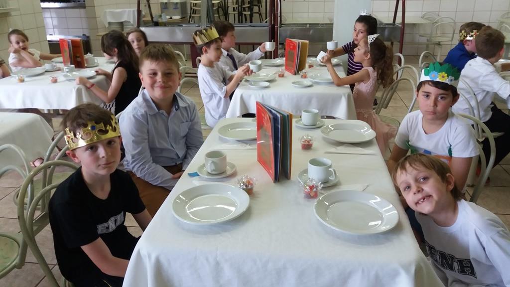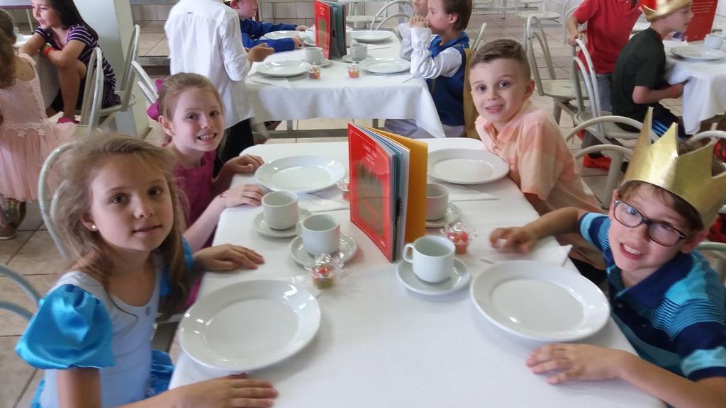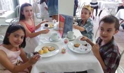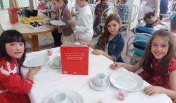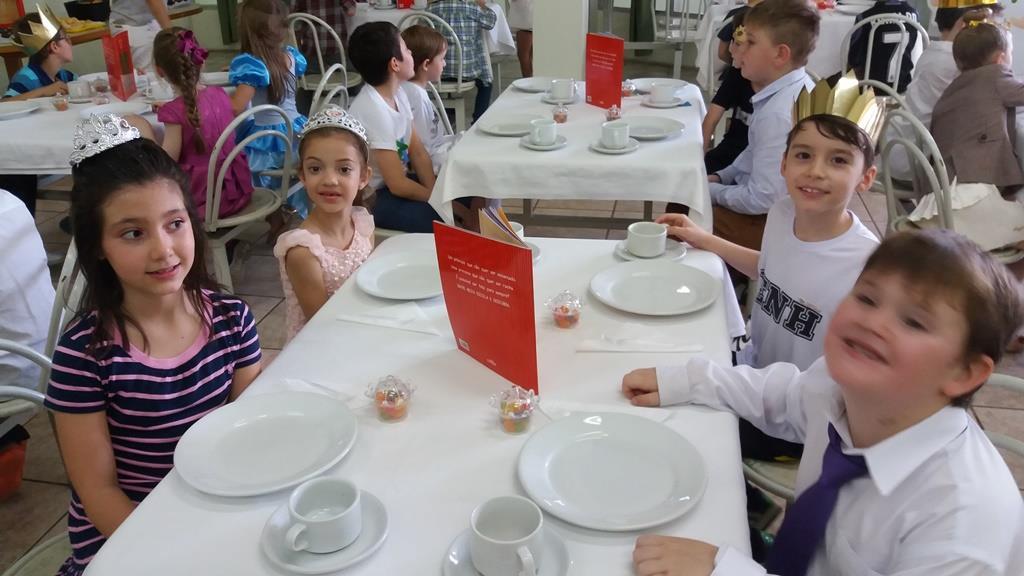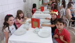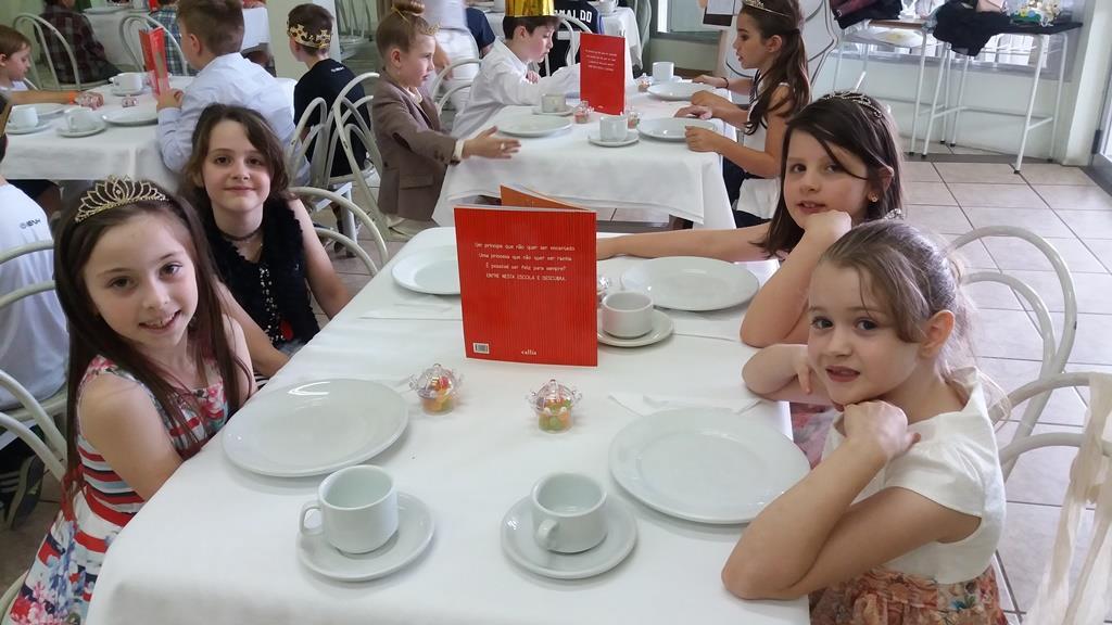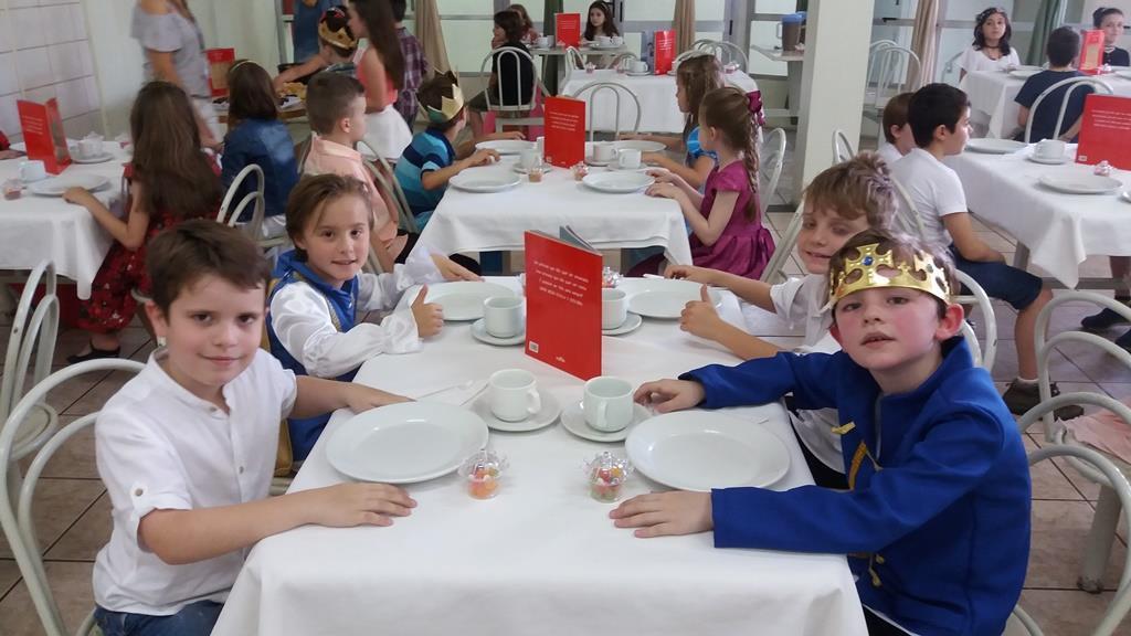 O lanche da tarde foi um delicioso chá real. Os chás foram colhidos pelos alunos diretamente da horta escolar. Também degustaram cookies que fizeram no dia anterior, bolo e pão de queijo.
