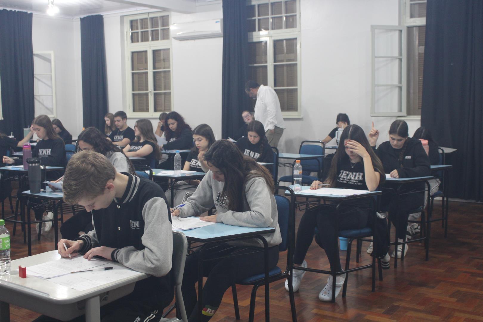 Os alunos da 2ª série realizaram o primeiro simulado, com foco em compreensão auditiva e de leitura, habilidades essenciais para o exame. Já as turmas da 3ª série participaram do segundo simulado, voltado à produção escrita em Língua Espanhola.
