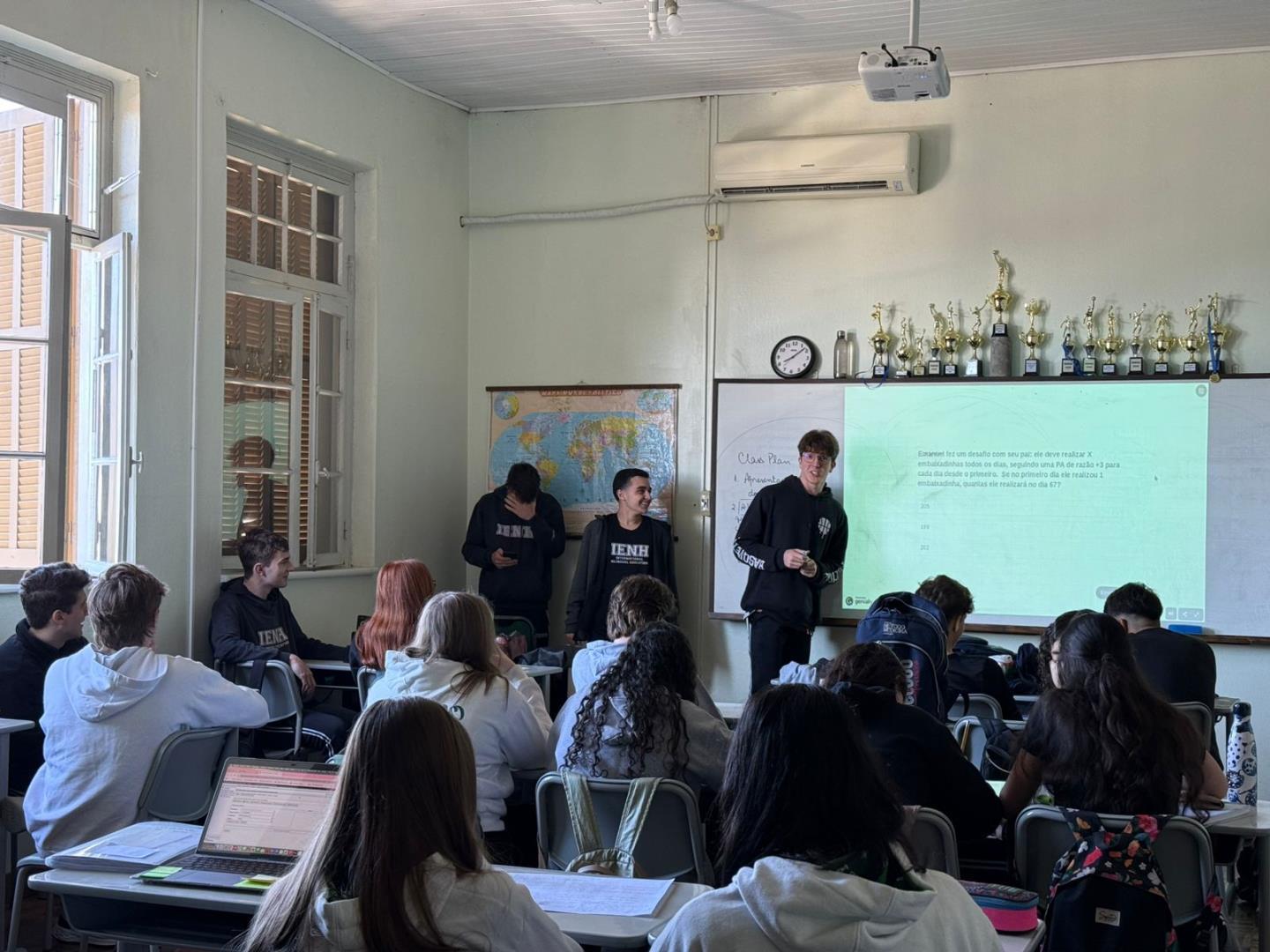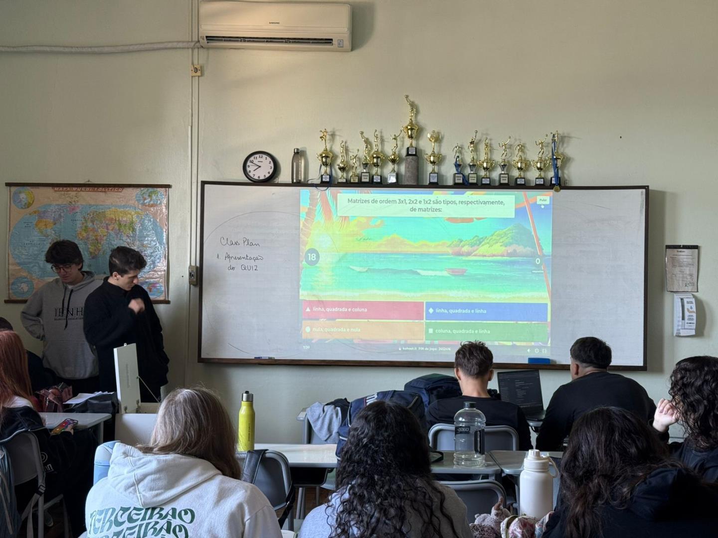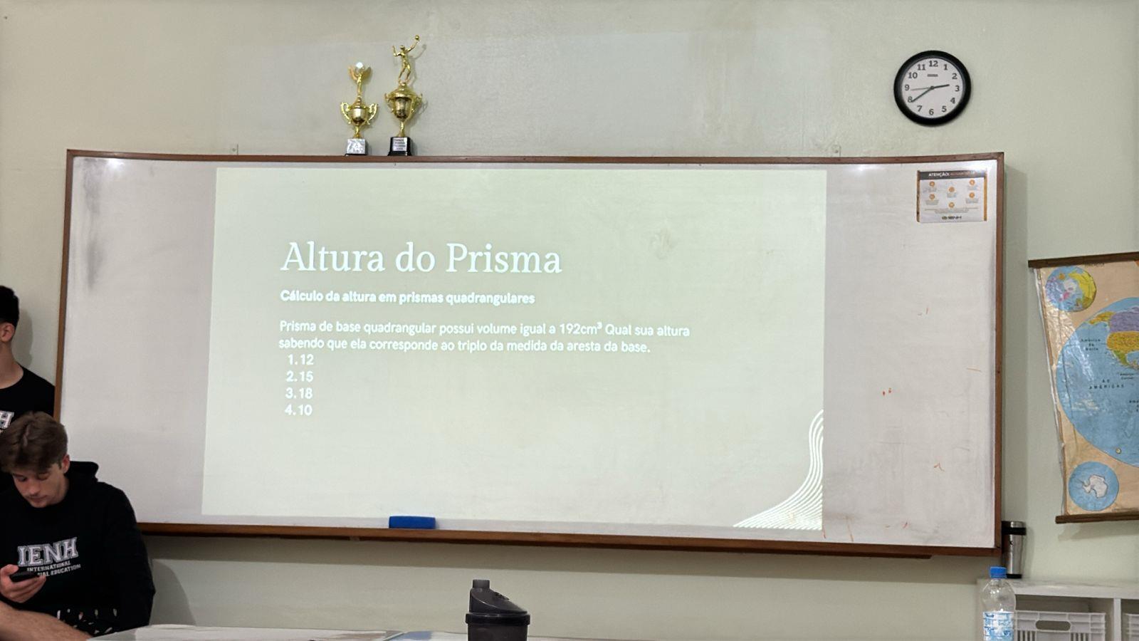 Além disso, utilizando ferramentas de Inteligência Artificial, a professora de Matemática Marjunia Klein elaborou uma apresentação no Google Apresentações com os conteúdos que mais têm sido abordados nas provas do ENEM nos últimos anos. O material foi discutido em sala de aula, auxiliando os estudantes a direcionar seus estudos.
