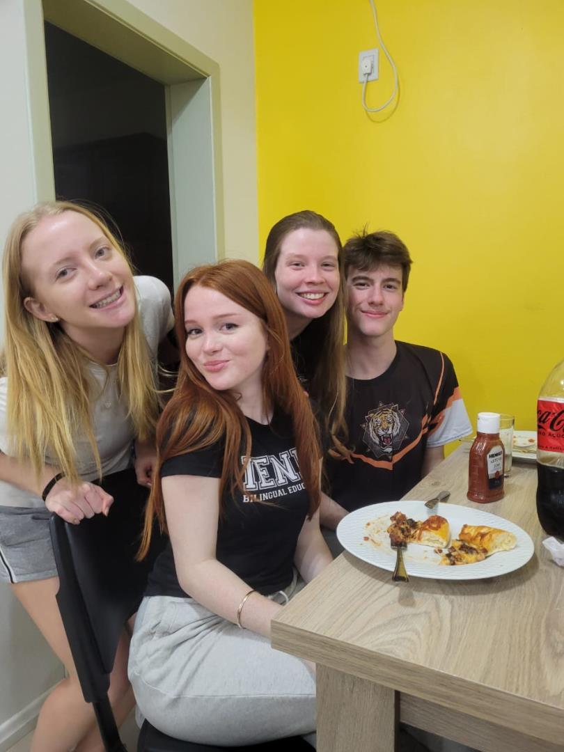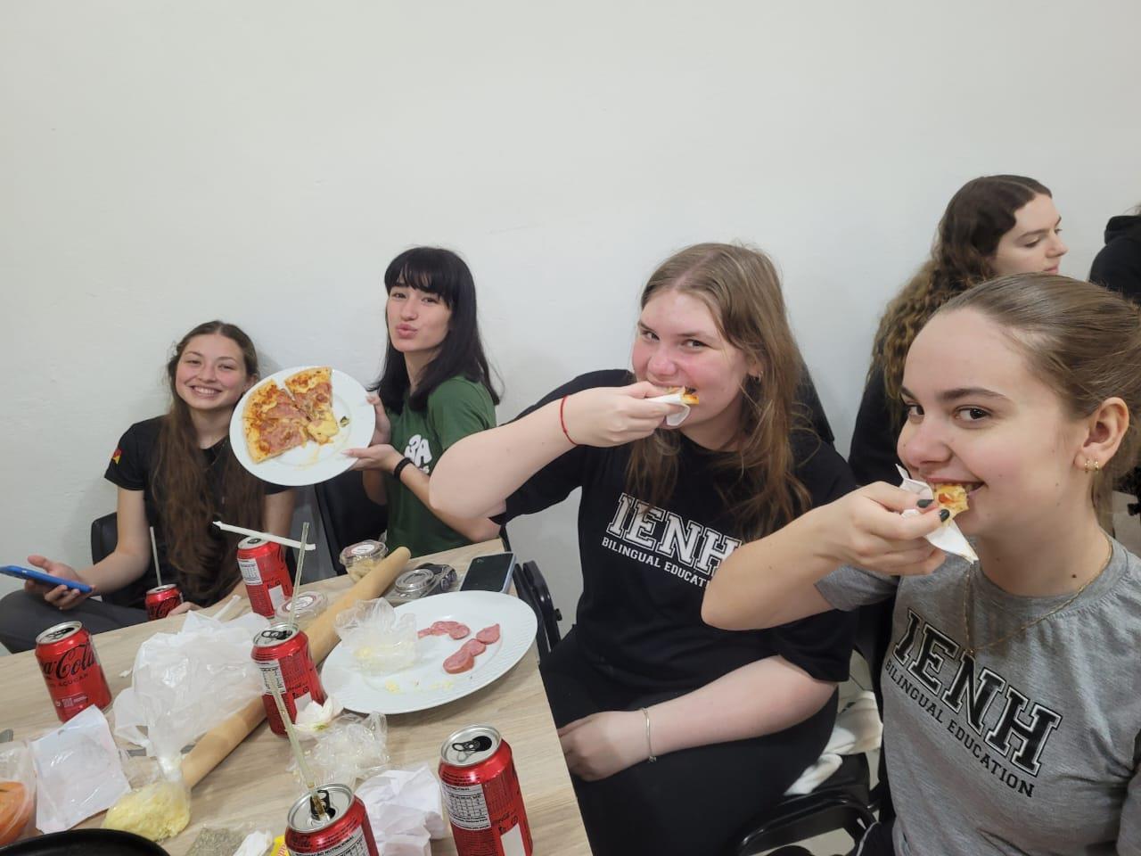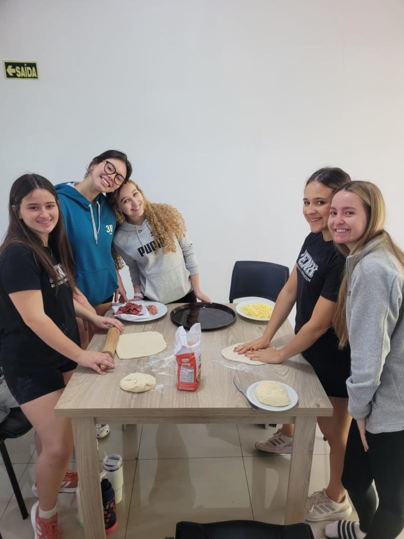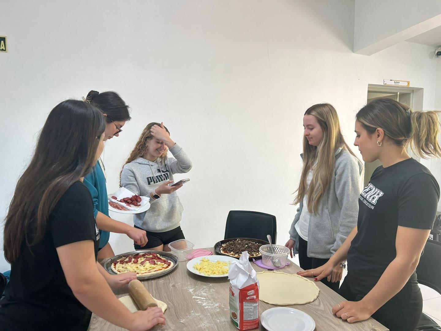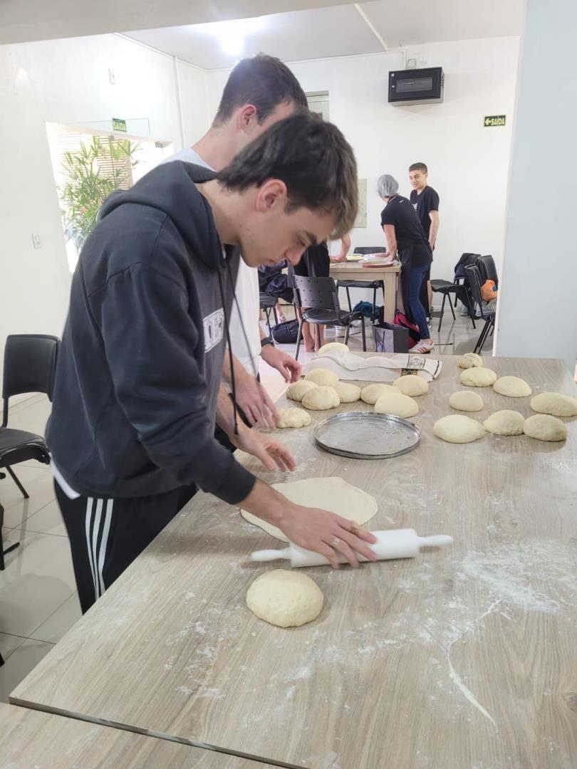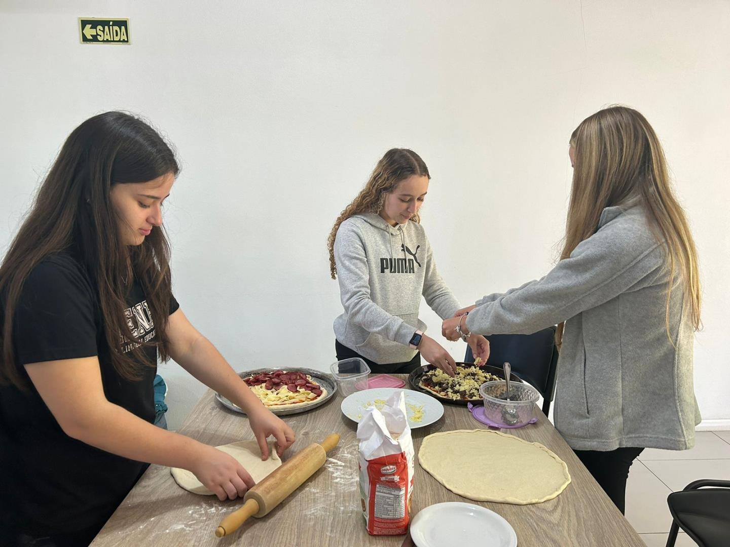 Após o preparo das pizzas, os estudantes encerraram a atividade com um momento de confraternização, saboreando juntos o resultado do trabalho em equipe e celebrando a experiência de aprendizado vivenciada na cozinha.
