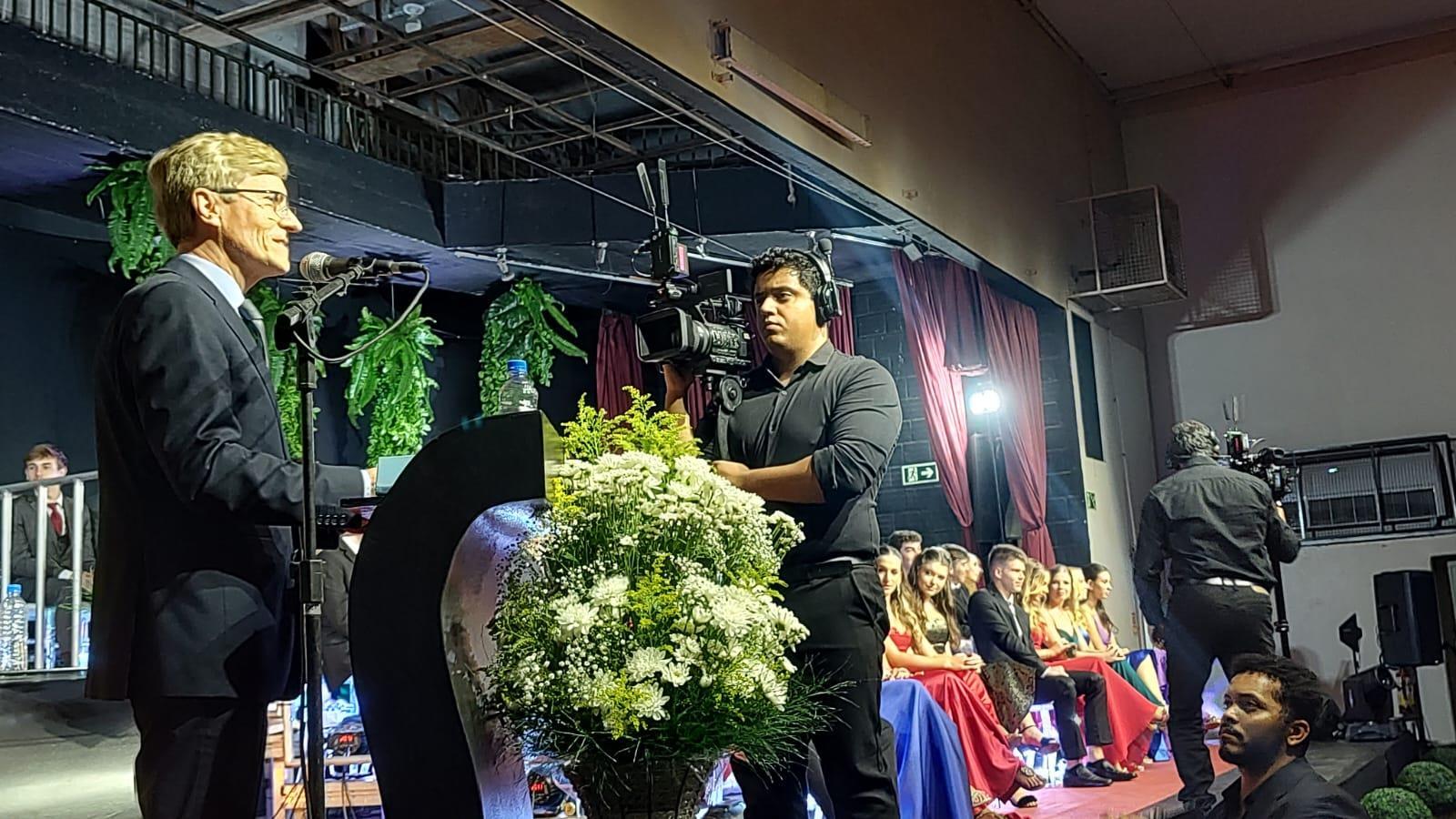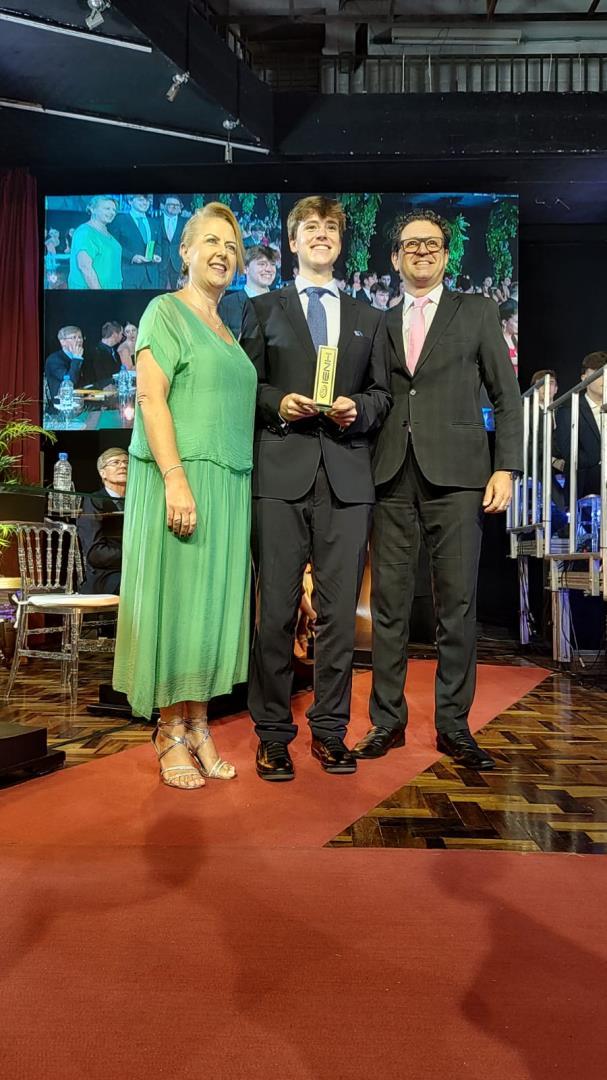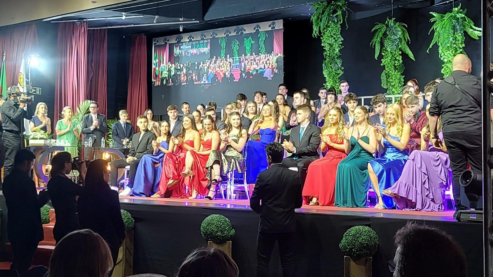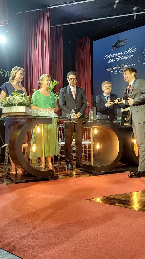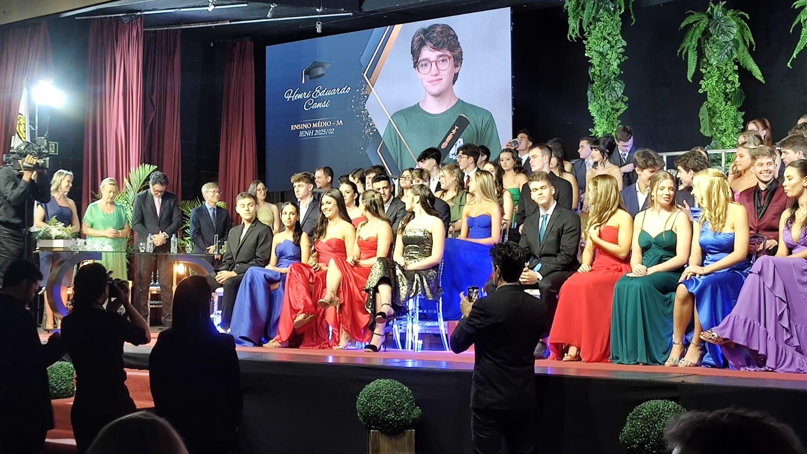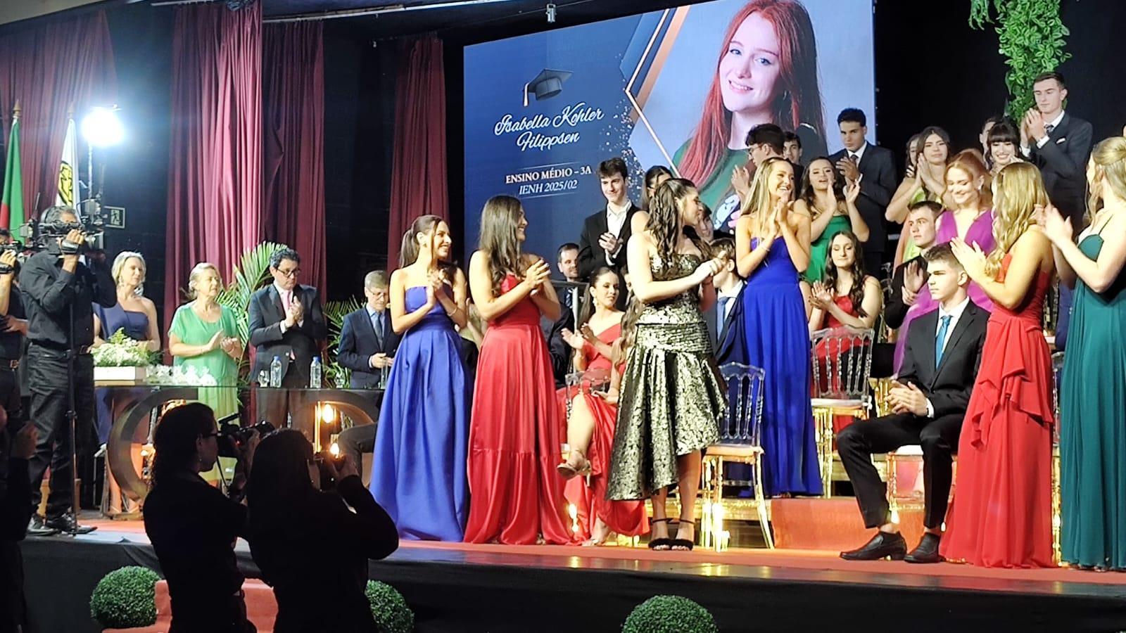 Durante a entrega dos diplomas, também foi realizada uma homenagem especial aos estudantes que fazem parte da IENH desde a Educação Infantil ou desde o 1º ano do Ensino Fundamental do Currículo Internacional Bilíngue, reconhecendo a longa trajetória construída dentro da Instituição. Um dos destaques da noite foi a menção à formanda Margherita Longhi, que veio da Itália para realizar intercâmbio na IENH e optou por estender sua permanência para concluir o Ensino Médio na escola.