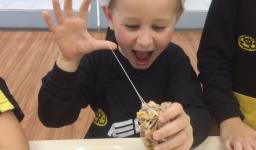 Em conjunto com as Professoras Kelly Melo e Luana Böes, os estudantes assistiram a história cantada “The Egg - de Mike Withla”, que fala sobre um ovo de dinossauro que rolou montanha abaixo e se perdeu da família. Após o final “triste”, os alunos decidiram criar um novo fim para a história de uma maneira divertida. Para isso, a turma preparou e degustou “ovos de dinossauros” na aula de Língua Inglesa.