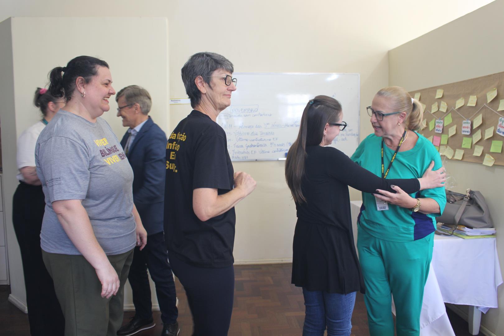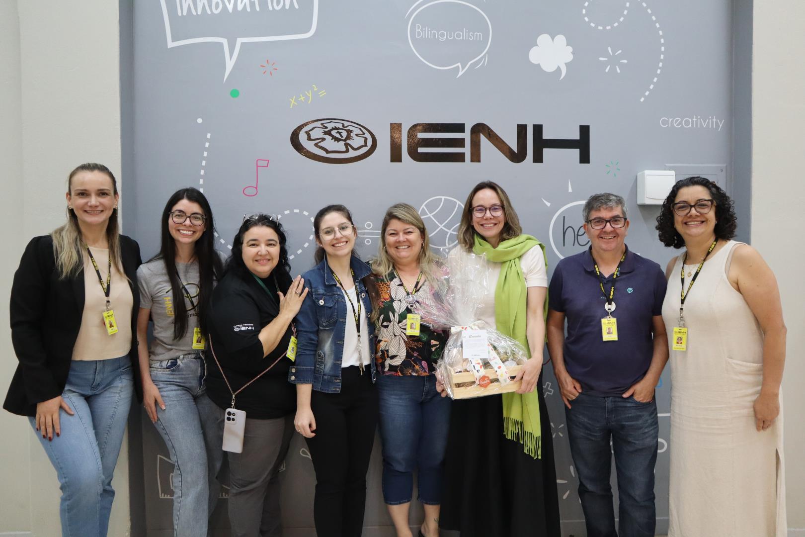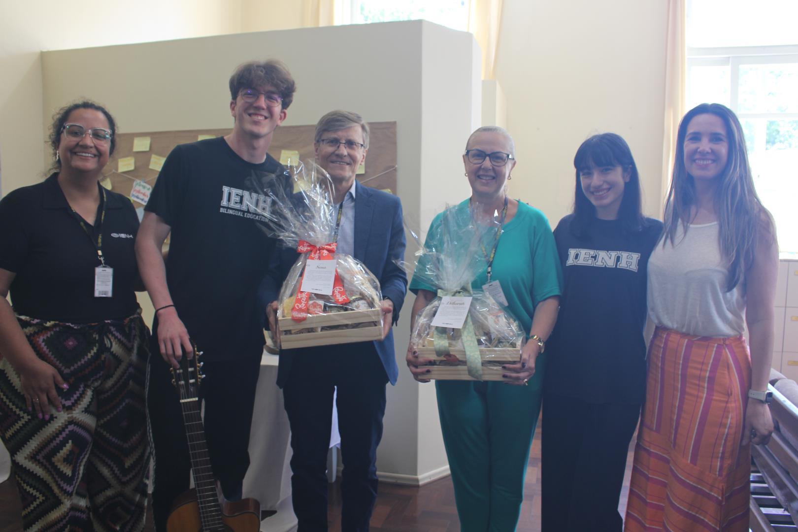 Na parte da noite, integrantes da equipe administrativa e pedagógica da IENH deram continuidade à celebração, realizando a entrega da cesta de homenagem à vice-diretora do Ensino Superior e dos Cursos Técnicos, Renata Roos, reforçando o reconhecimento a todos que contribuem diariamente para a qualidade da educação e o fortalecimento da comunidade escolar.