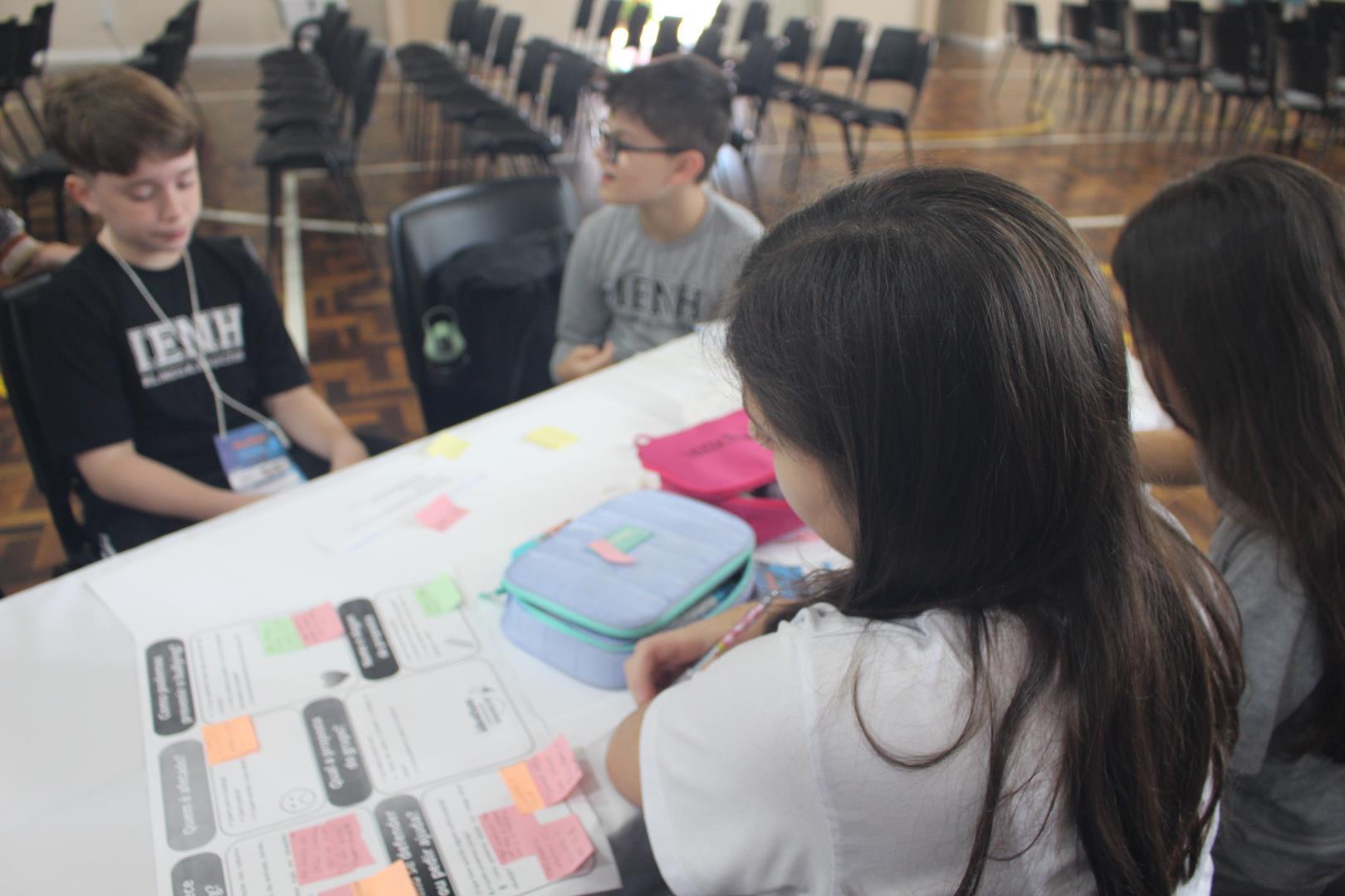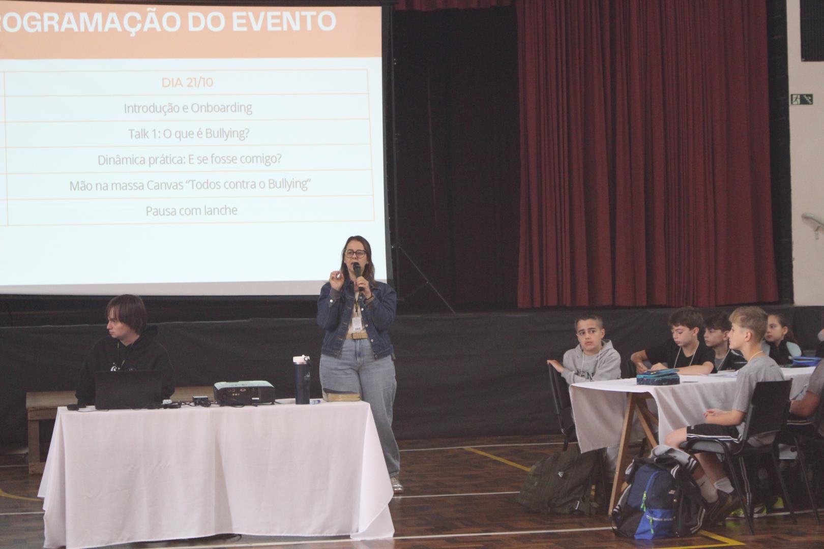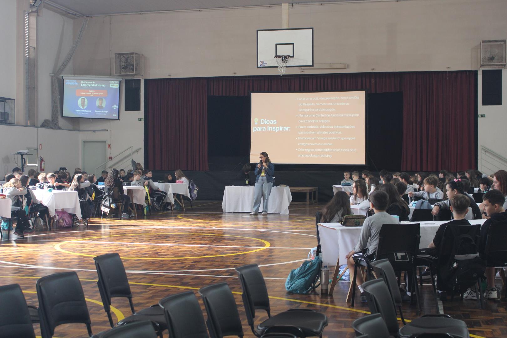 Durante a manhã, os estudantes participaram de momentos inspiradores e dinâmicos, como painéis de reflexão, rodas de conversa e a elaboração de propostas no Canvas “Escola sem Bullying”, que desafiou os grupos a identificar situações de bullying e propor ações práticas para combatê-las.