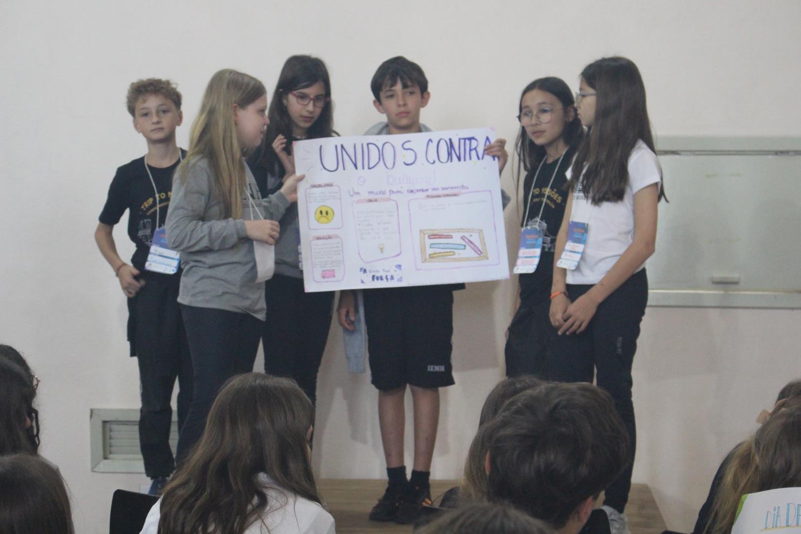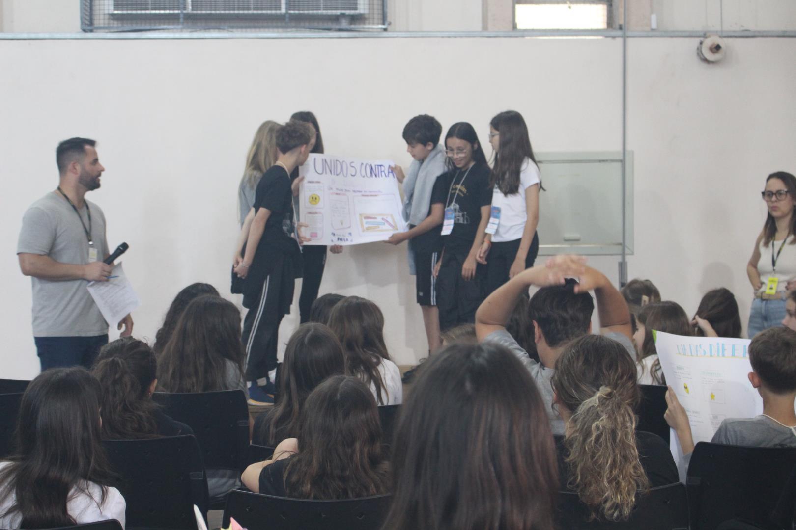 Com o tema “Como podemos prevenir e enfrentar o bullying na escola?”, o evento teve como propósito estimular o pensamento crítico e criativo dos alunos sobre o tema, promover empatia e respeito, e incentivar o protagonismo estudantil na criação de soluções coletivas.