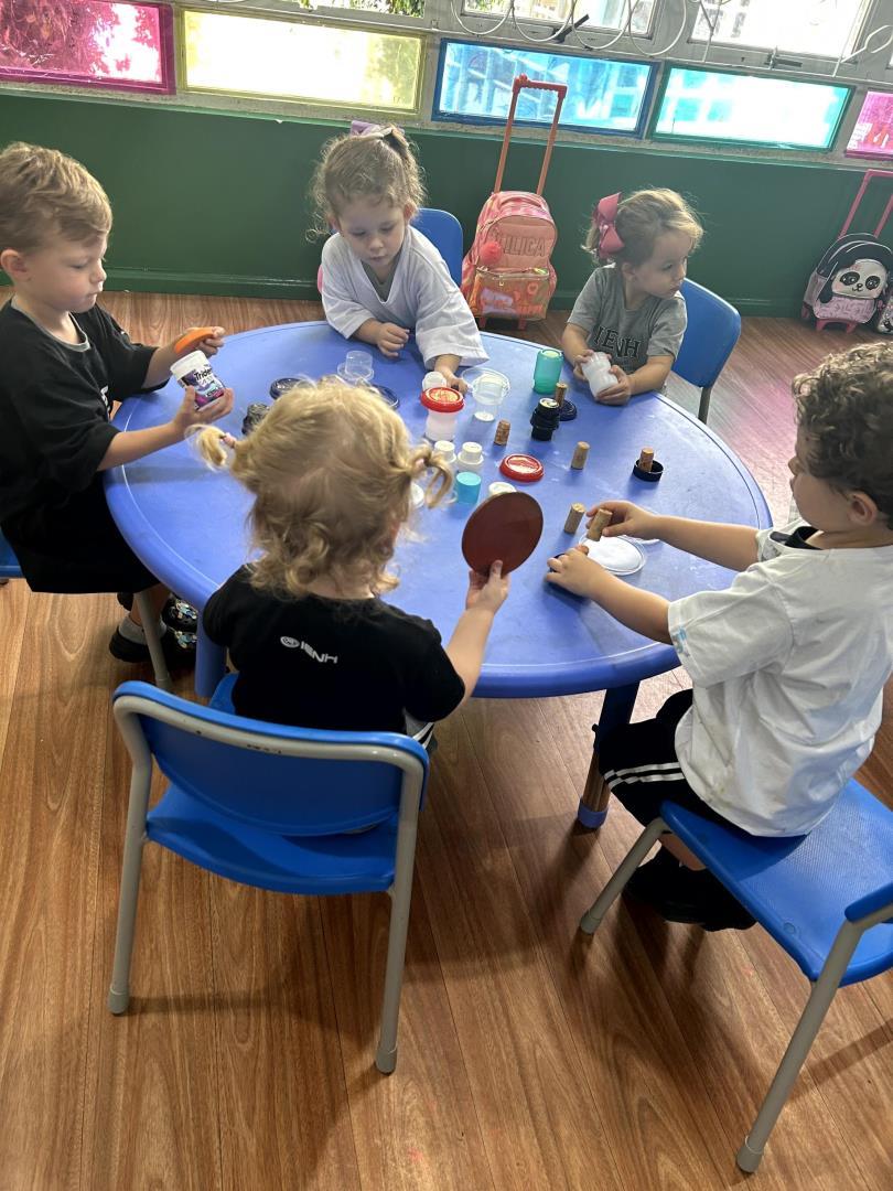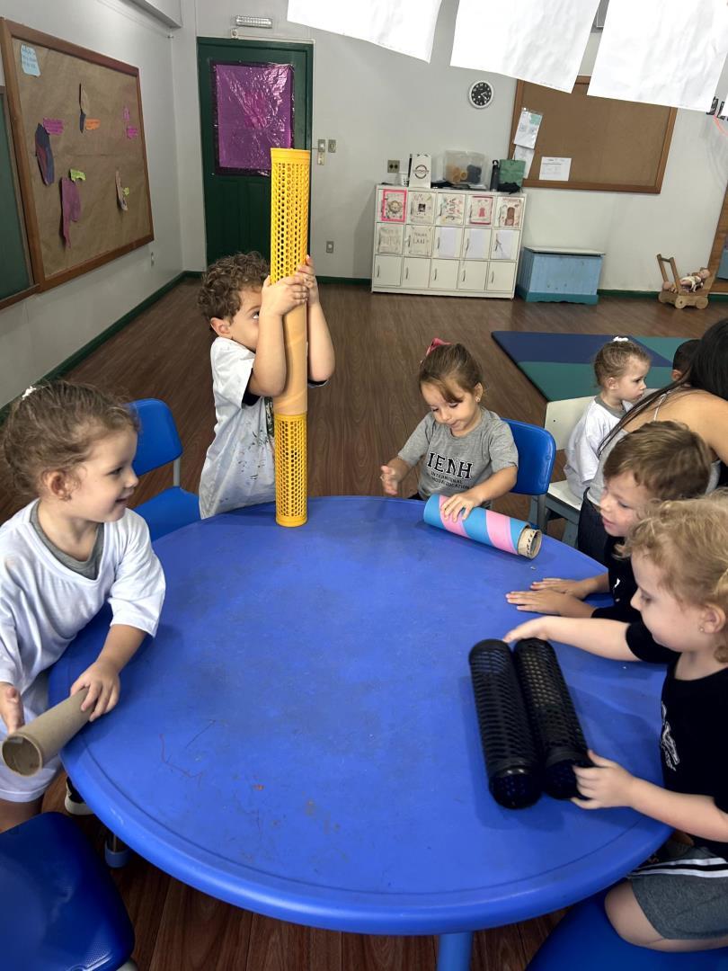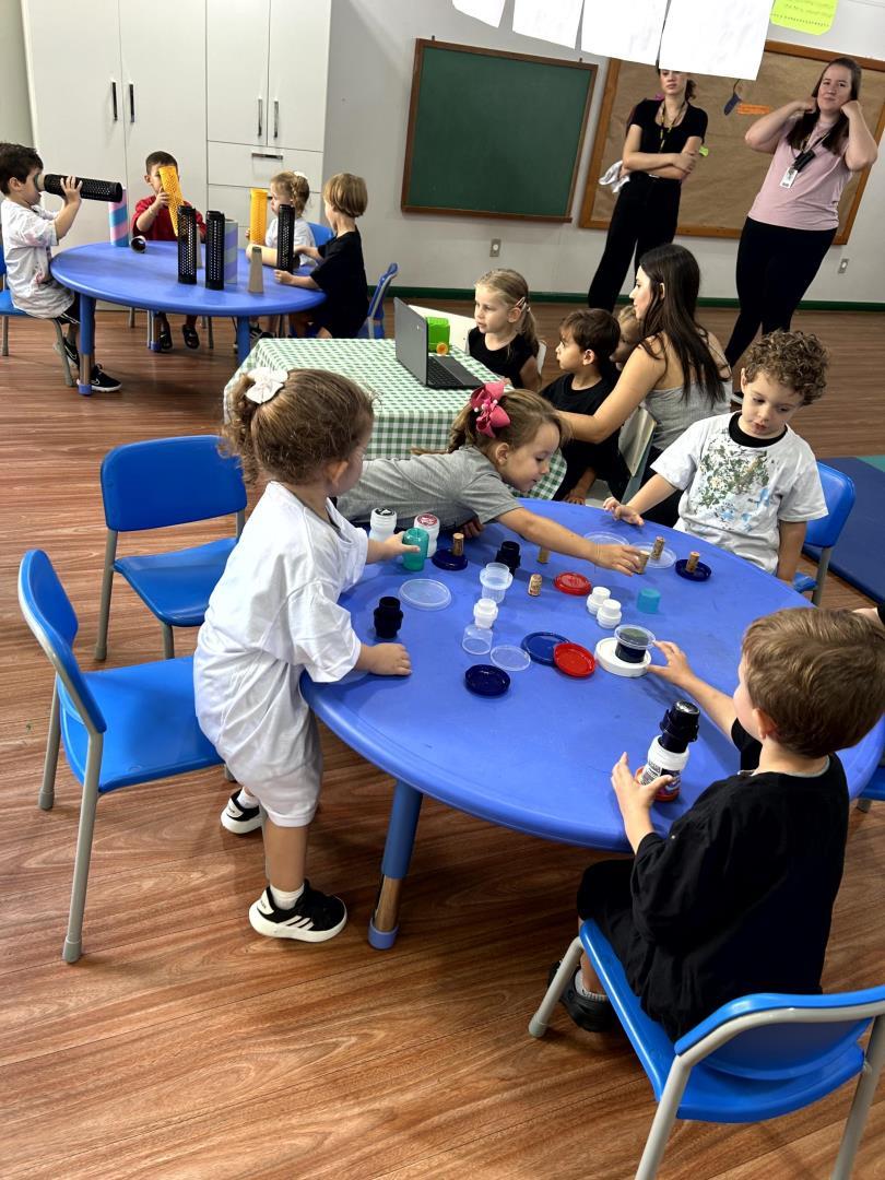 Inicialmente, as crianças participaram de um momento de Learning Center em sala de aula, explorando diferentes materiais como rolhas, tampinhas, balões e cones. Esses elementos foram observados e manipulados livremente, estimulando a curiosidade e a percepção de formas e texturas. Durante esse momento, os alunos também assistiram a um breve vídeo sobre a obra, ampliando o repertório visual e artístico.