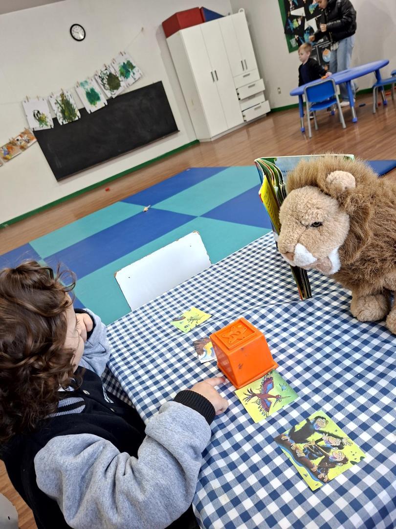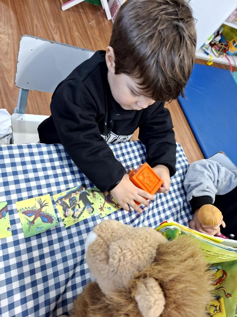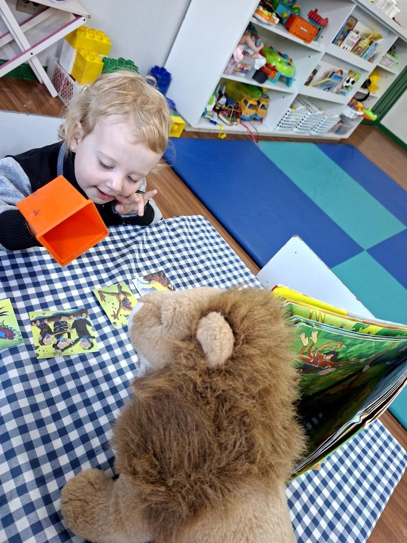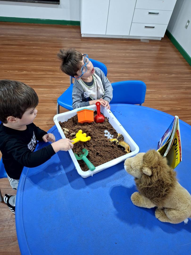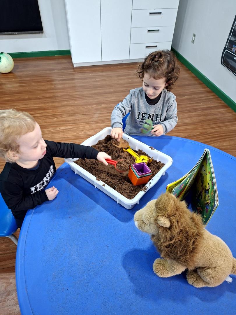 Já no Learning Center de Língua Inglesa, os estudantes foram desafiados a encontrar os personagens da história, a família de leões, em uma bandeja sensorial com areia, nomeando-os em inglês: baby lion, daddy lion e mommy lion.