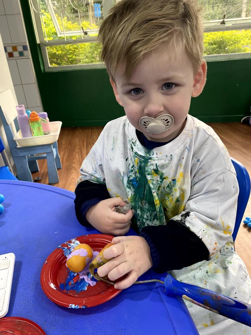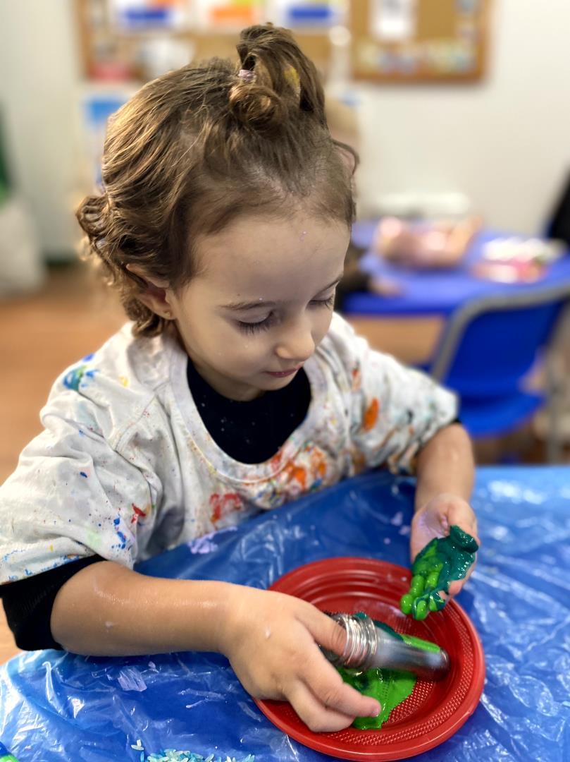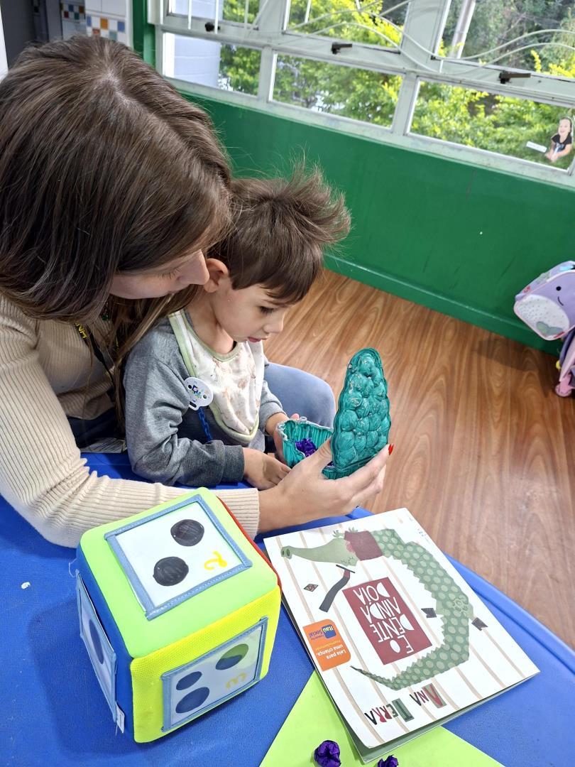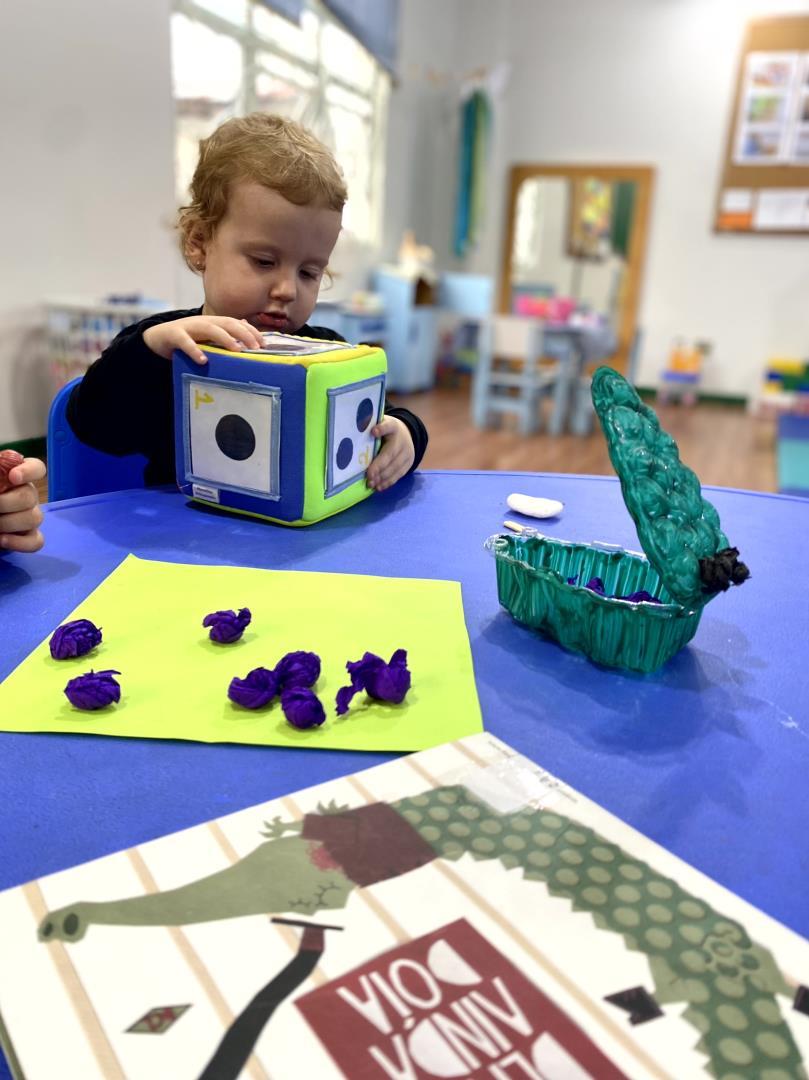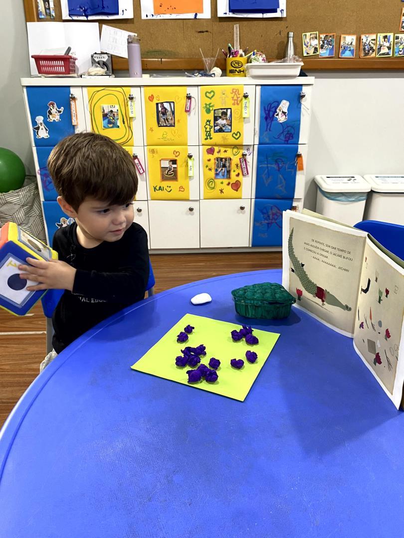 No Learning Center de Língua Materna, as crianças participaram de uma brincadeira matemática inspirada na história do jacaré com dor de dente. Com o auxílio de um dado, os pequenos sortearam números e alimentaram o jacaré feito de sucata com “jabuticabas” de papel crepom amassado, exercitando a contagem e a motricidade fina. Em seguida, cantaram a música “Pé de Jabuticabeira”, de Kitty Driemeyer, e confeccionaram chocalhos, unindo musicalidade e expressão artística.