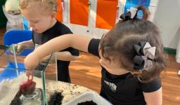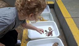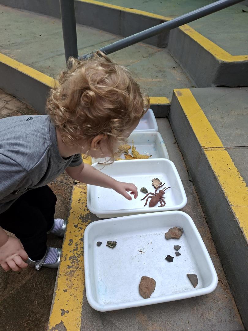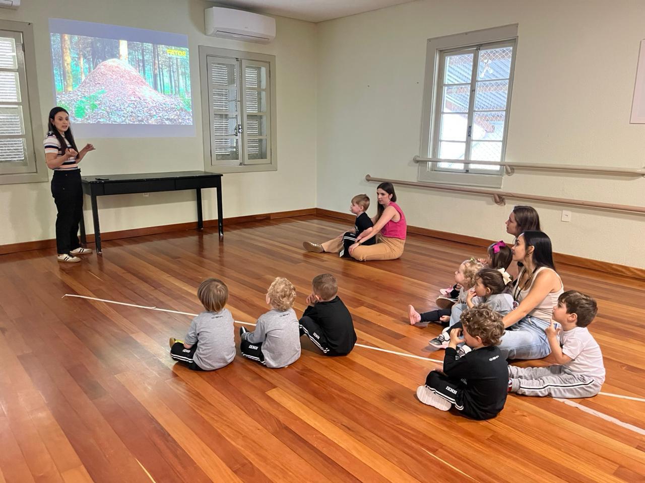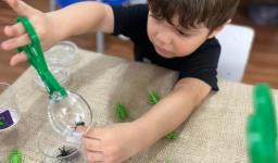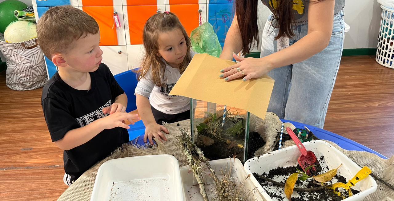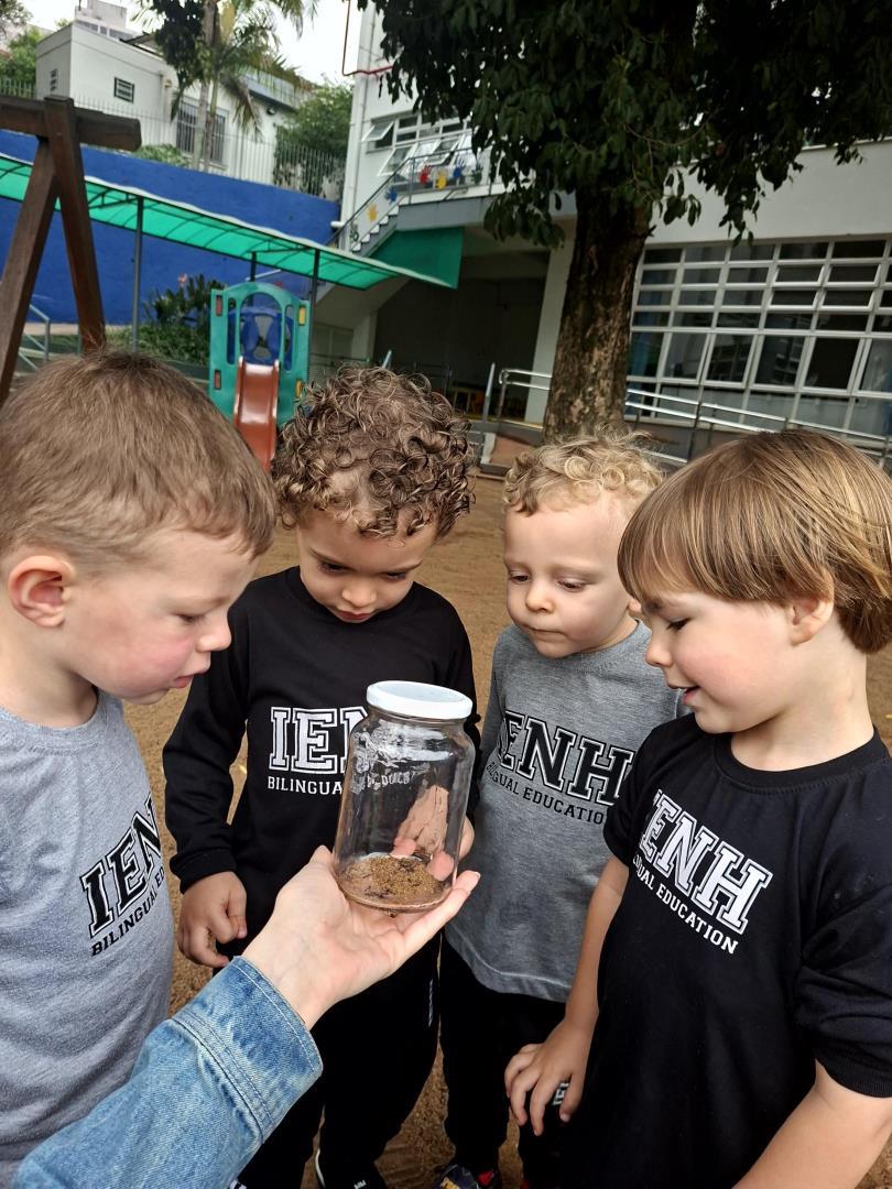 Ao longo da semana, os estudantes exploraram o universo das formigas e de seus formigueiros por meio de diferentes atividades. Assistiram a vídeos educativos, cantaram a canção tradicional “The Ants Go Marching”, observaram formigas no pátio e coletaram elementos da natureza para compreender mais sobre o habitat desses pequenos insetos.
