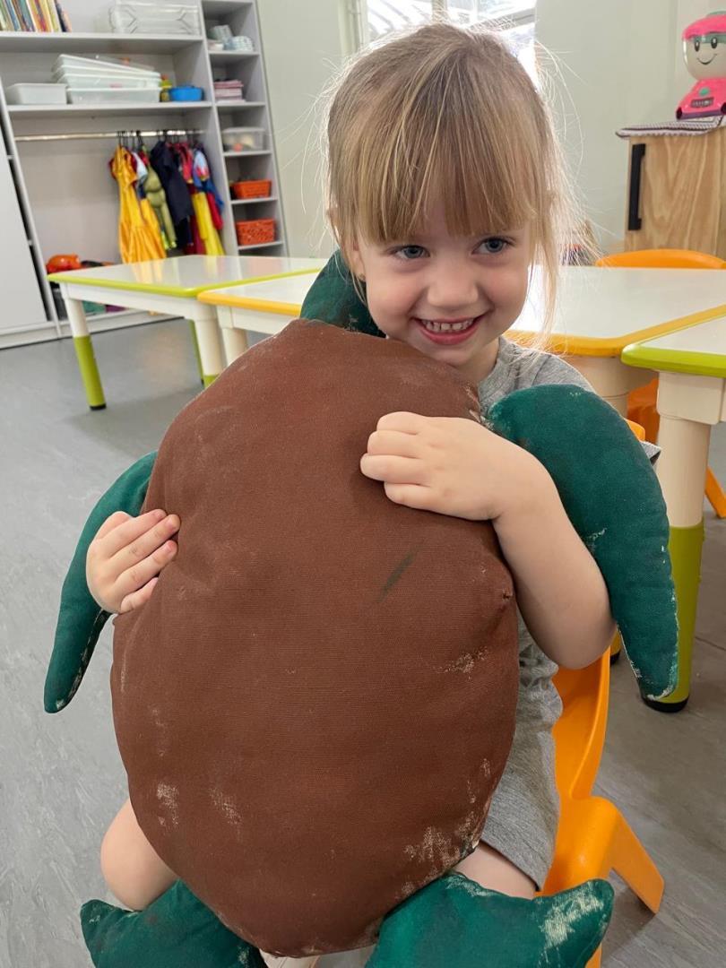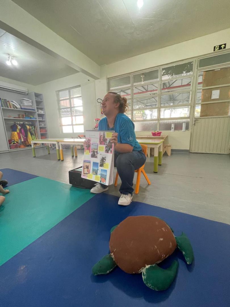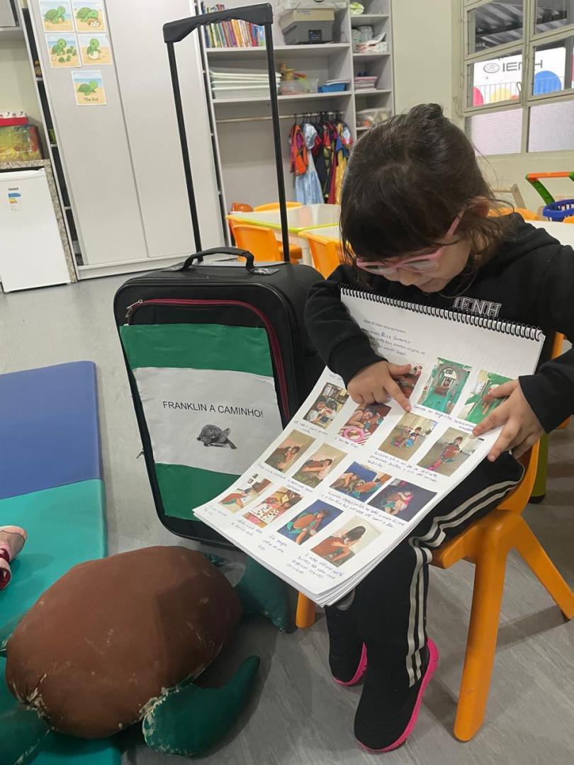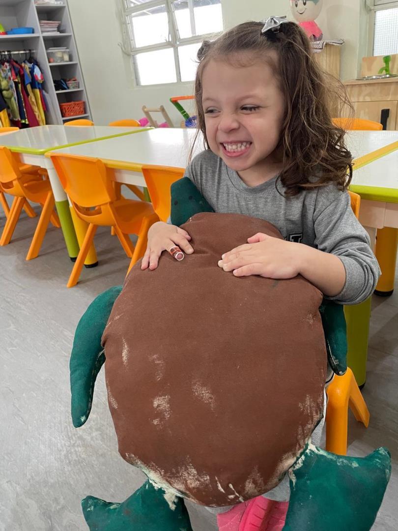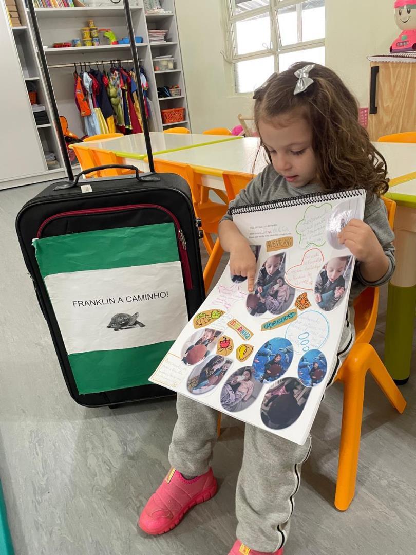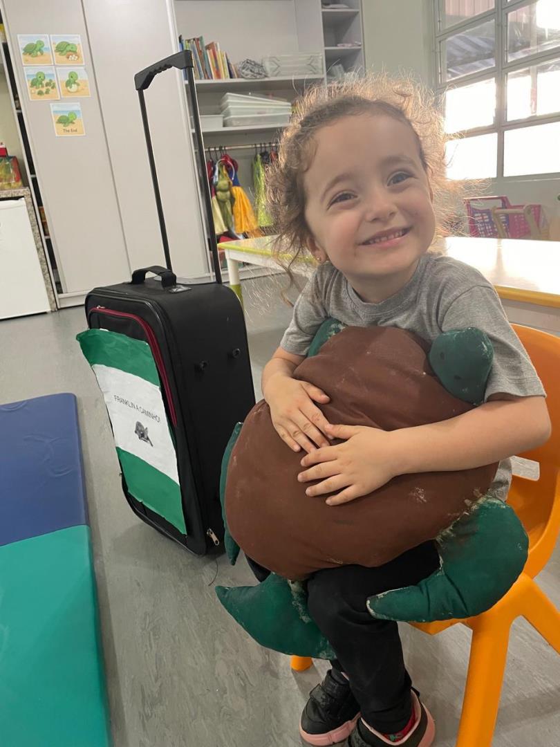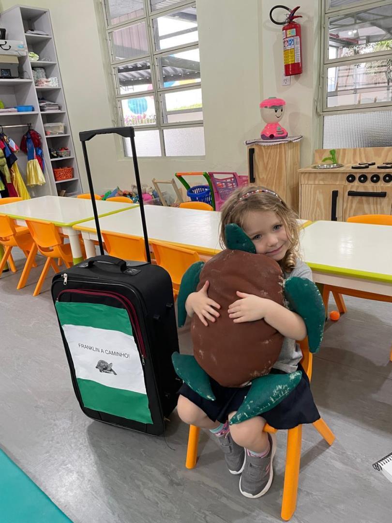 Para tornar a experiência ainda mais significativa, a turma confeccionou um mascote de pano: a tartaruga Franklin. Os estudantes participaram de todo o processo, da escolha do nome à pintura e aos preparos finais, criando um vínculo especial com o personagem que acompanhou o grupo ao longo do projeto.