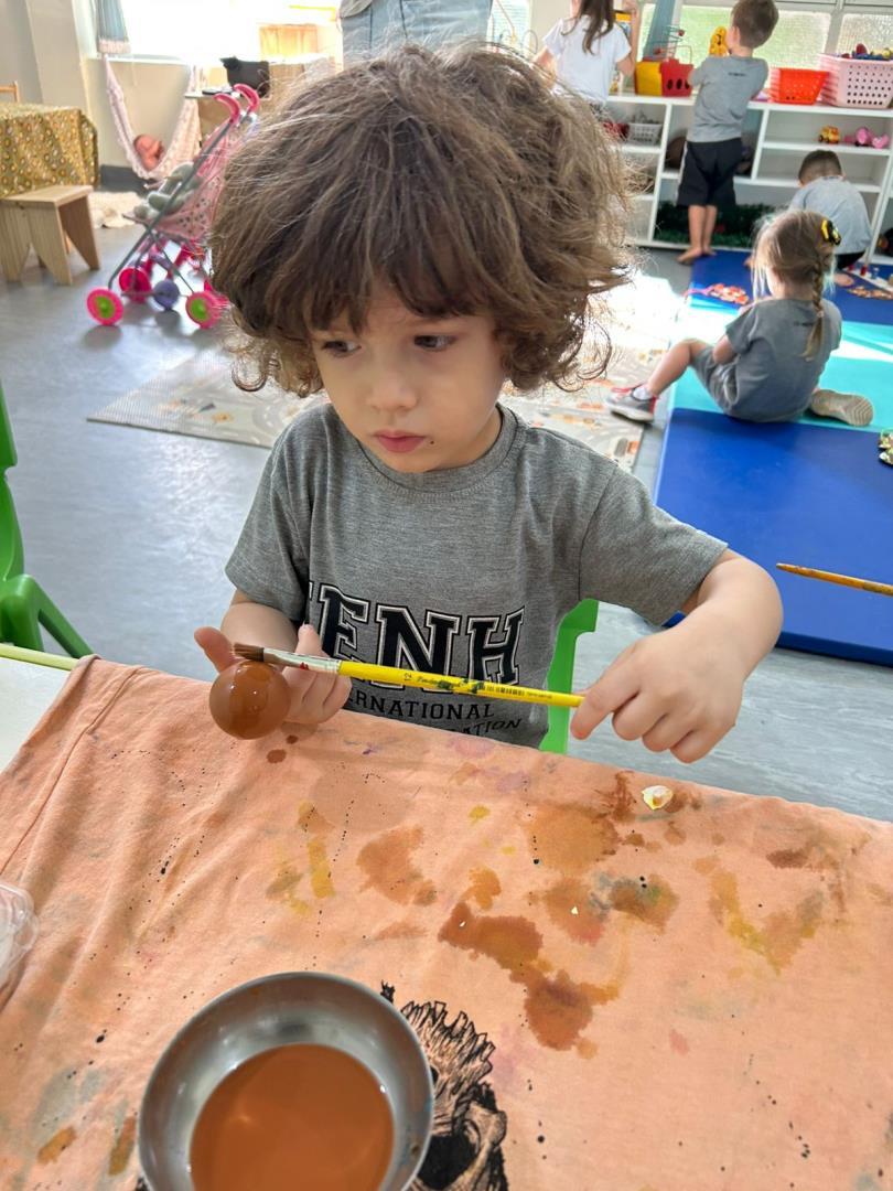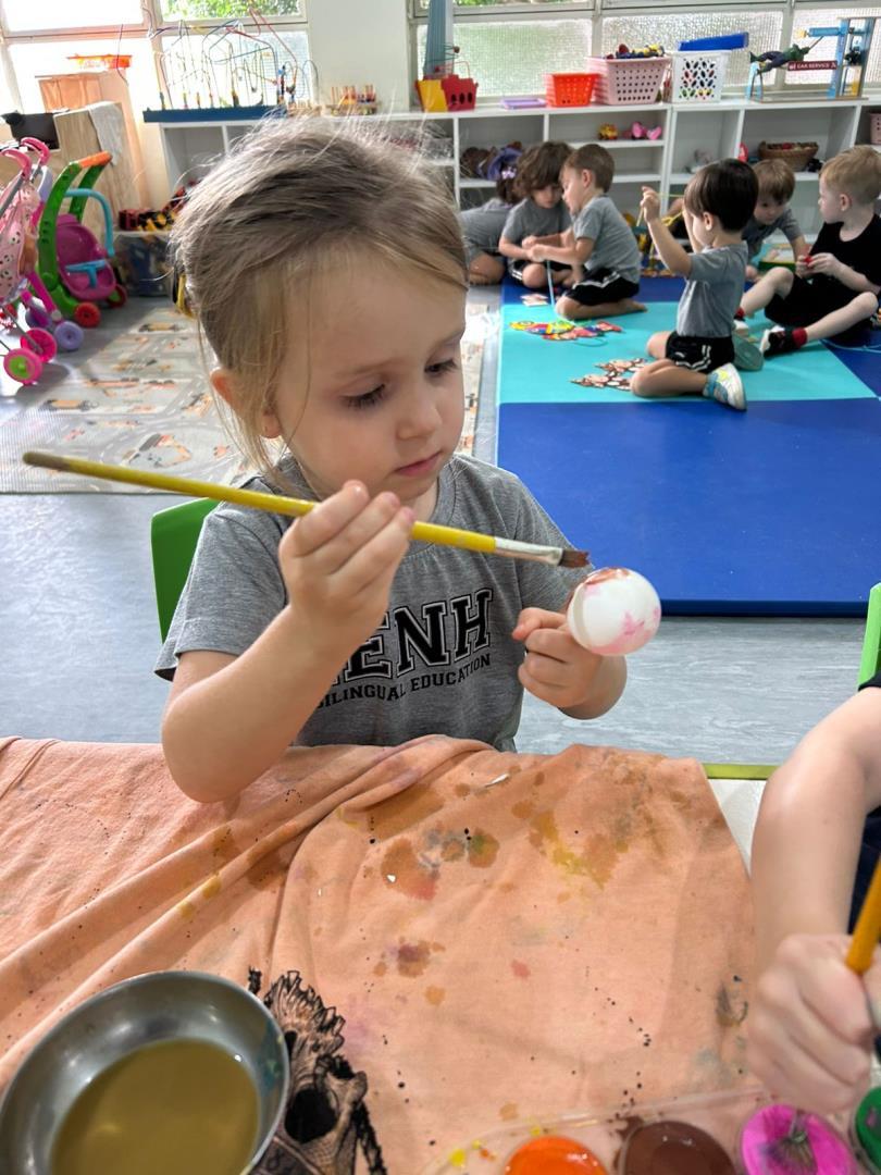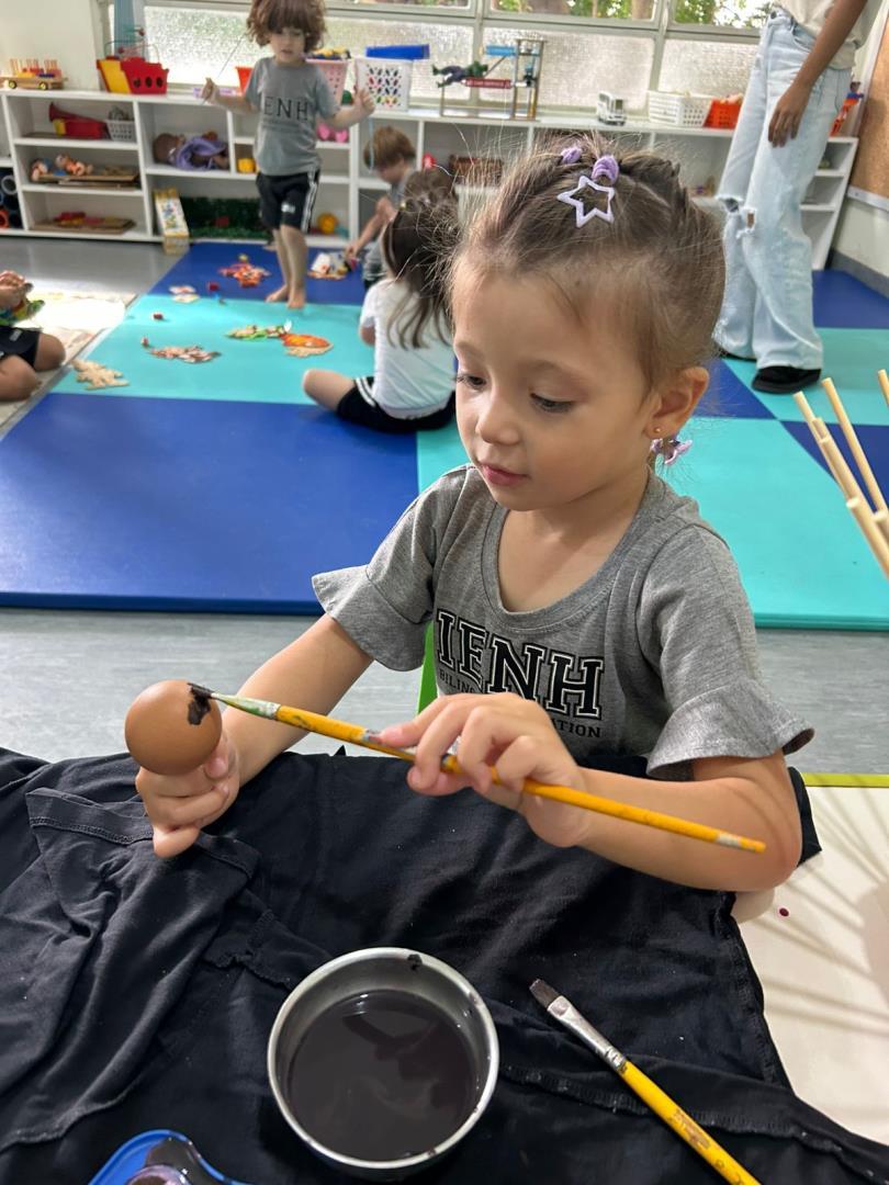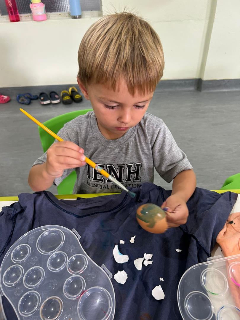 A proposta também incluiu a montagem da Osterbaum (Árvore de Páscoa), tradição de origem alemã presente na cultura brasileira. As crianças pintaram casquinhas de ovos e participaram da montagem da árvore, relacionando símbolos como renovação e esperança de forma significativa.