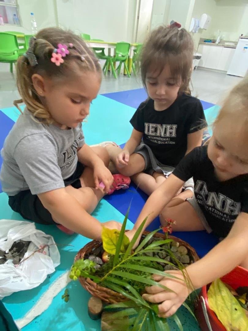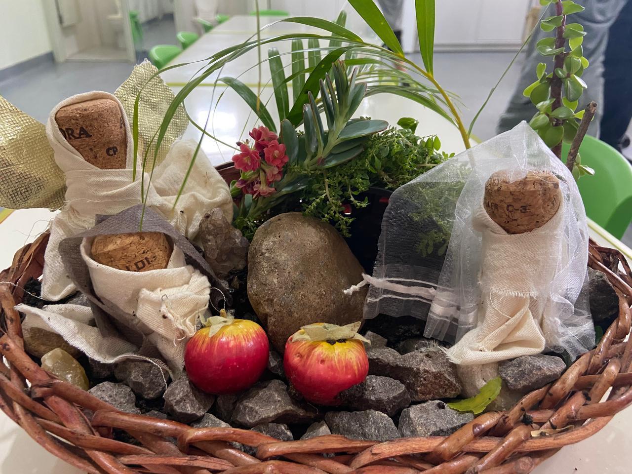 Como parte das vivências, a turma construiu coletivamente um Jardim da Ressurreição, utilizando elementos naturais como terra, pedras e plantas. A atividade estimulou a expressão criativa, o contato com a natureza e a compreensão de ciclos da vida.
