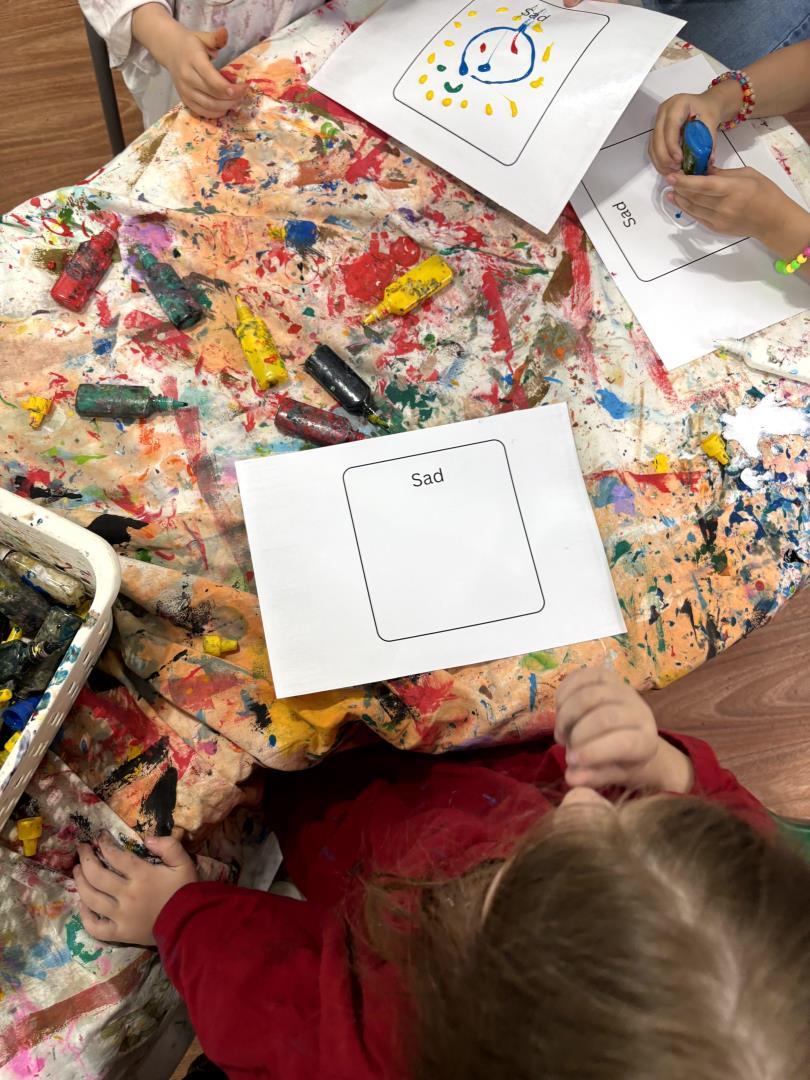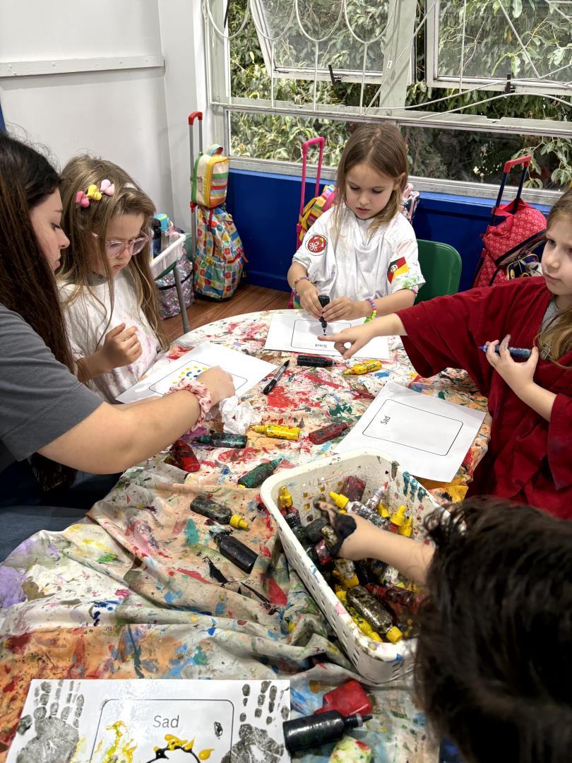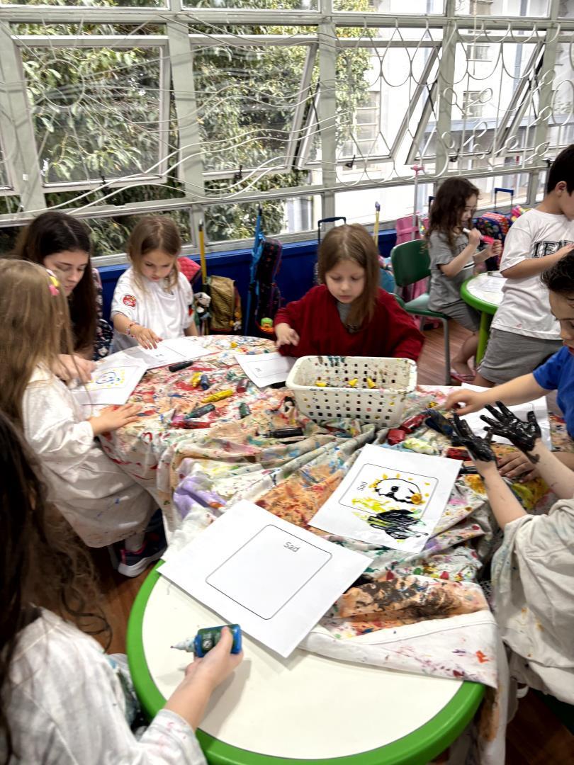 Durante a atividade, as crianças confeccionaram seus próprios emotion cards com as principais emoções que haviam aprendido a nomear. Utilizando cola colorida e giz líquido, cada aluno registrou suas percepções de maneira única e expressiva. A vivência ocorreu em um momento de learning centers, no qual diferentes espaços propunham desafios voltados à compreensão e representação dos sentimentos.