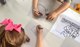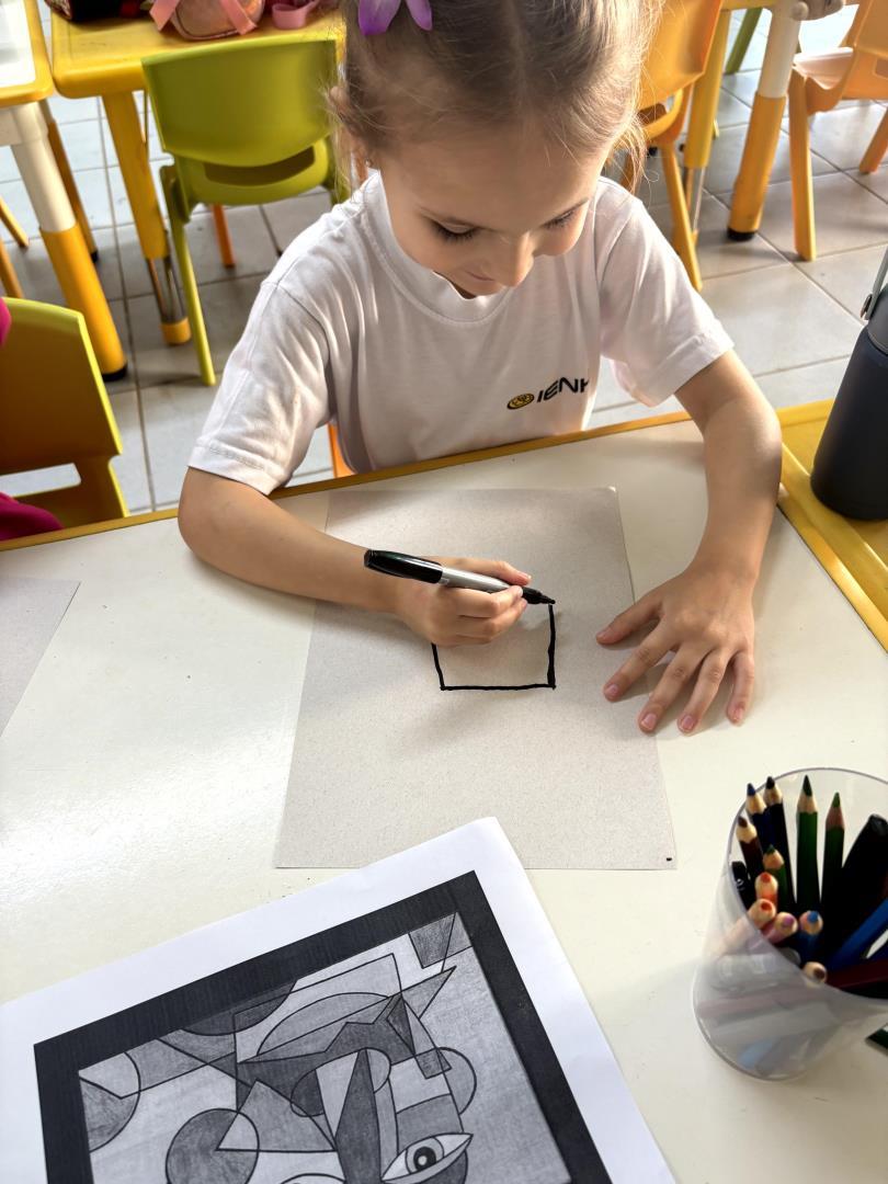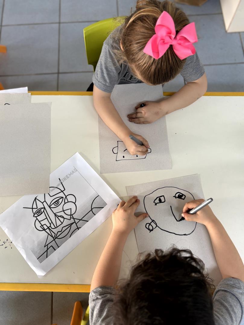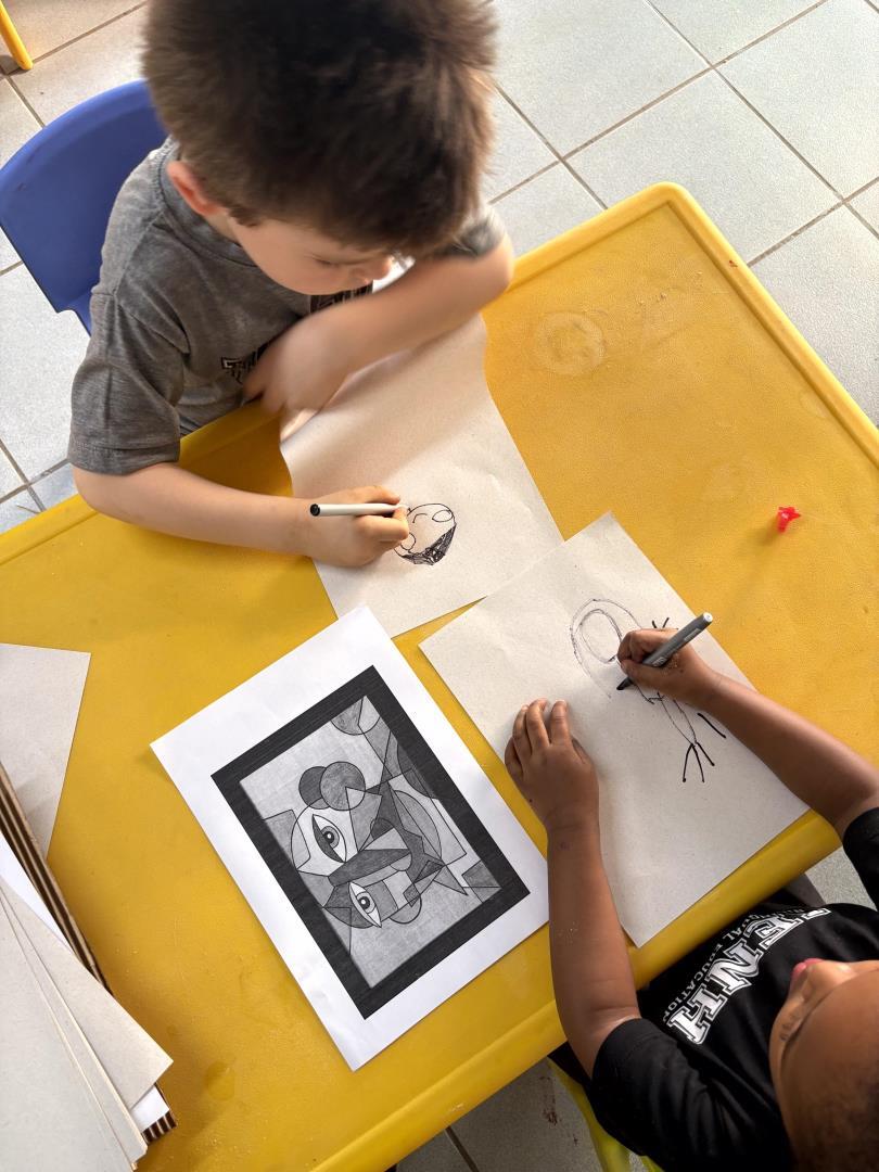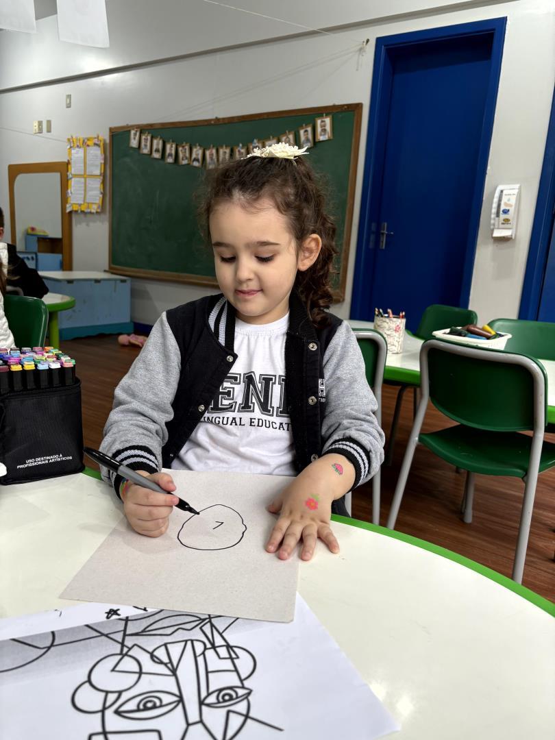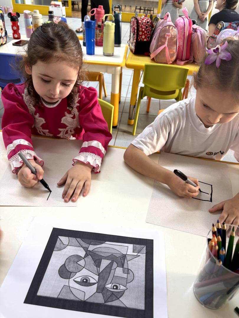 Inspirados nas obras de Pablo Picasso e em suas representações do corpo humano através de formas geométricas, os alunos foram convidados a observar como retângulos, quadrados, triângulos e círculos podem expressar diferentes percepções e identidades. A partir dessa reflexão, cada estudante produziu um autorretrato utilizando as formas como elementos principais de composição.
