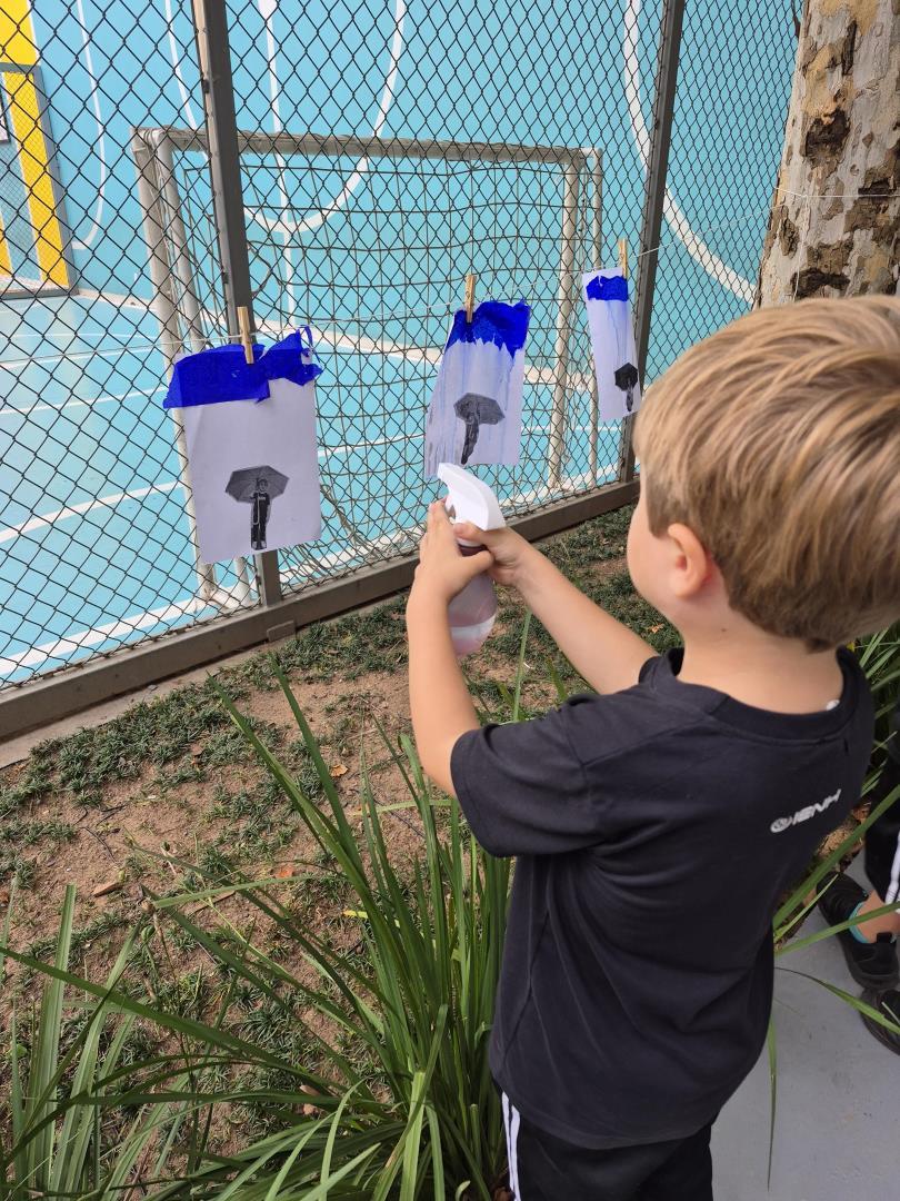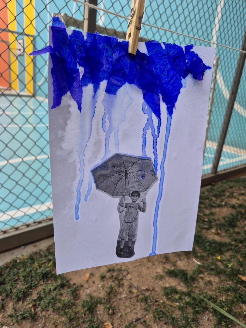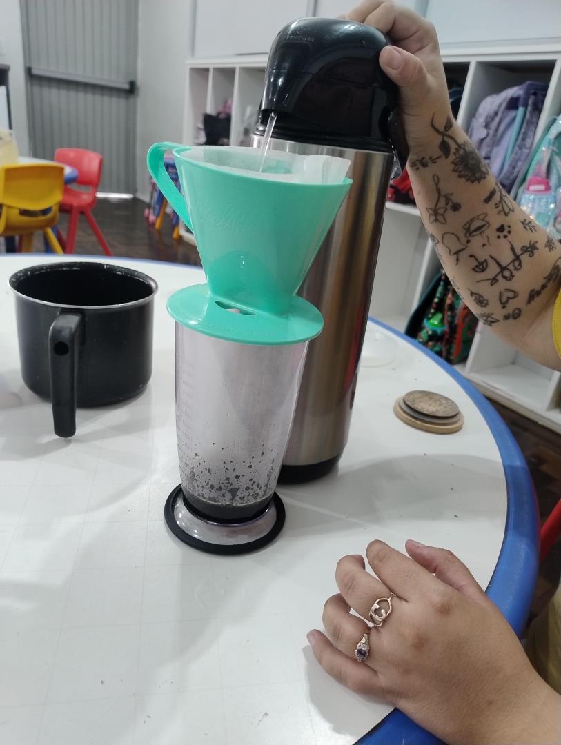 Além disso, as crianças observaram, de maneira concreta, os estados físicos da água e suas transformações, bem como sua capacidade de transformar outros elementos, como o pó de café, utilizado em uma proposta artística. Também vivenciaram experiências sensoriais, como a produção de sons que imitam a chuva e registros fotográficos com o uso de guarda-chuvas, ampliando a percepção sobre a presença da água no cotidiano.