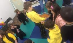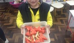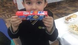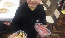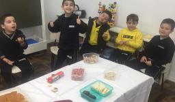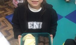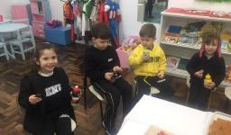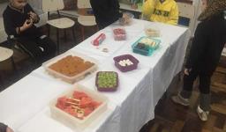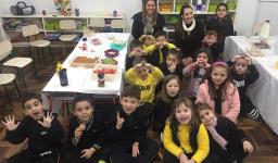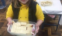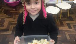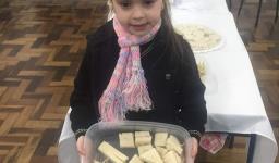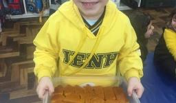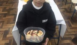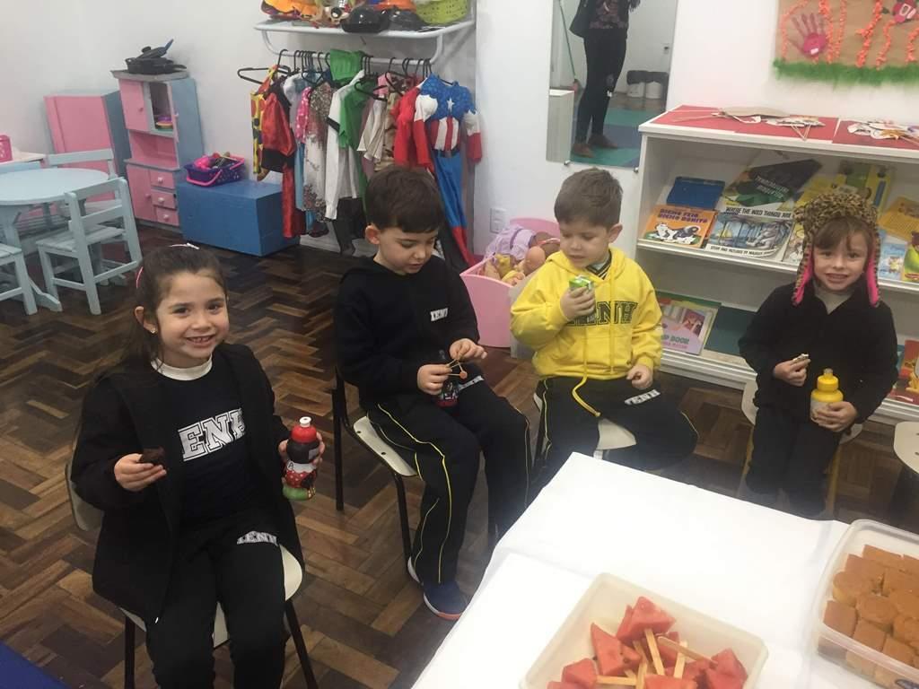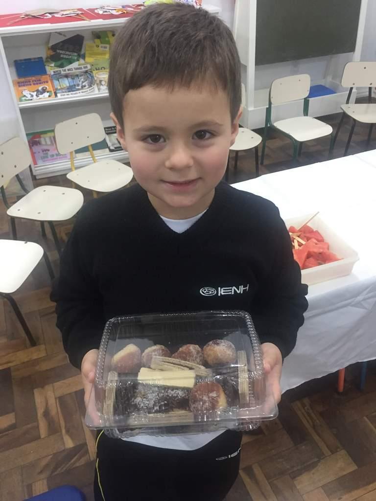 Para finalizar os estudos das formas, a turma realizou um lanche coletivo, em que os alunos e suas famílias foram desafiados a criarem lanches em formas geométricas. Antes de organizar a mesa, no dia 06 de junho, cada estudante apresentou o seu alimento para os colegas, verbalizando o nome do seu lanche e sua forma em Inglês e Português. “O resultado dos lanches foi surpreendente, pois estavam criativos, nutritivos e deliciosos. Foi um momento especial, em que os alunos ampliaram o vocabulário em Inglês sobre as formas e alimentos”, comenta a Professora. A partir de agora, a turma estudará os alimentos e os benefícios para o corpo.