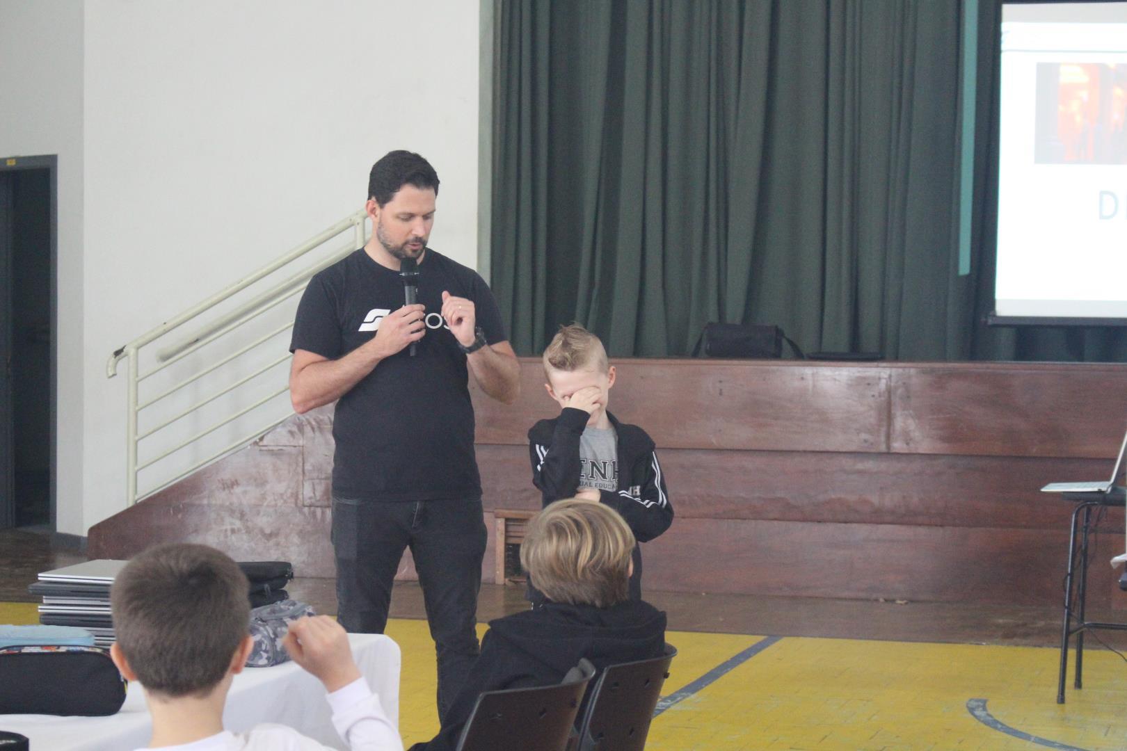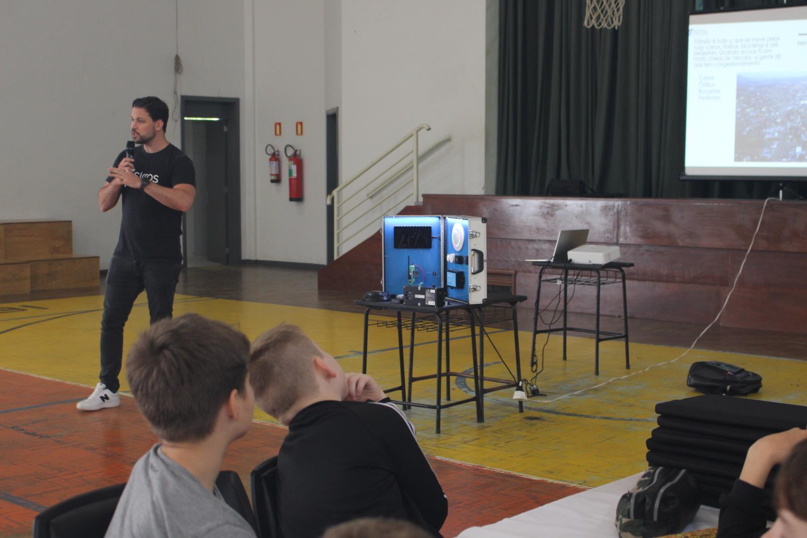 Realizada no ginásio da Unidade Pindorama, a atividade contou com três etapas dinâmicas. Primeiro, os estudantes participaram de um talk conduzido por Diego Schlindwein, CEO ( Chief Executive Officer) da Sirros IOT, uma startup de Indústria 4.0 eleita por dois anos consecutivos como a melhor startup de IOT do Brasil e tem no seu portfólio grandes empresas como clientes (Randon, ArcelorMittal, Tigre, dentre tantas outras). Além disso, o Diego apresentou conceitos e exemplos, mas também trouxe dispositivos de hardware IOT para demonstrar aos alunos.
