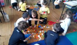 Arrecadar 270 tampinhas plásticas foi o desafio dos 3ºs anos. Além de recolher o número indicado de tampinhas, também pesquisaram o tempo que leva para esses materiais desaparecerem na natureza. Ao descobrirem o período de 150 anos, também pensaram em ideias de como utilizar as tampinhas. A solução encontrada foi a construção de objetos reciclados como spinner, roda de carrinho, peão, bonequinhos, além de arte com colagens e pinturas.