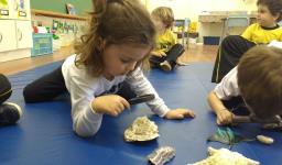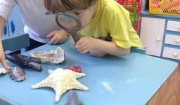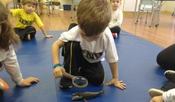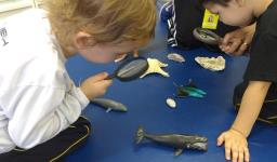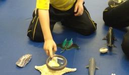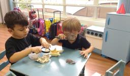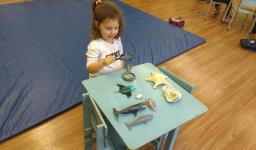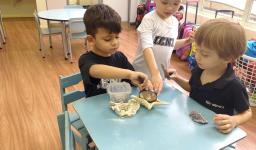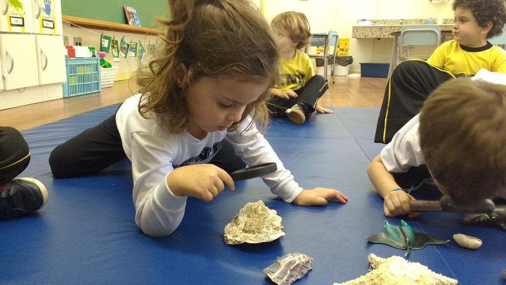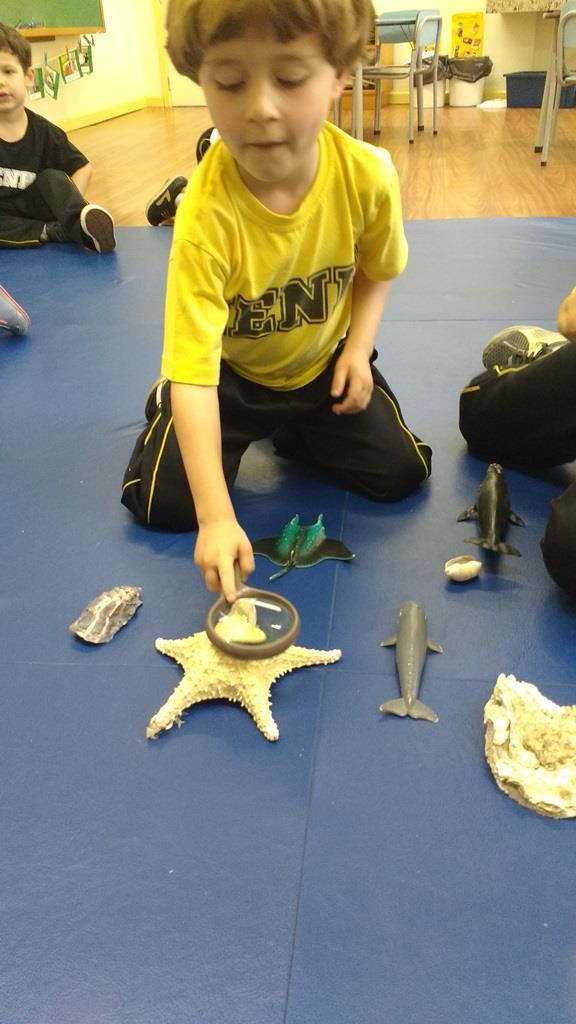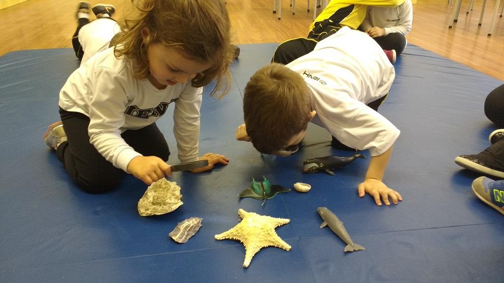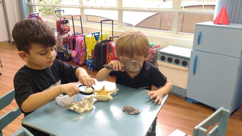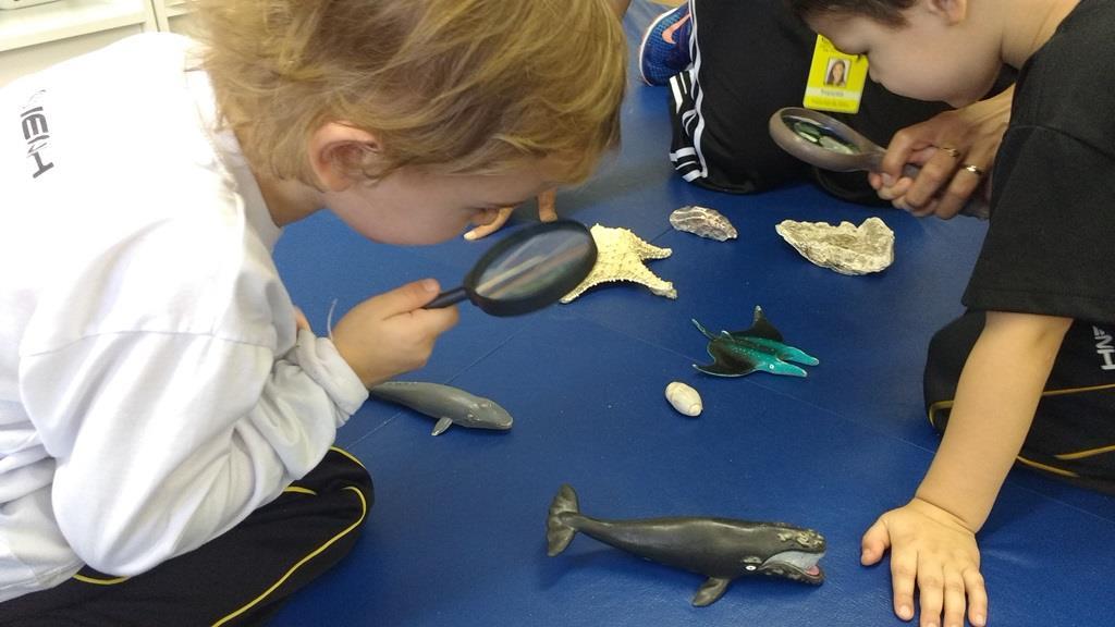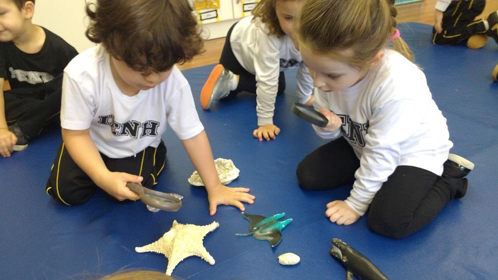 “As crianças estão muito envolvidas com as novas abordagens que estamos realizando referentes ao novo projeto. Já internalizaram algumas informações que pesquisamos juntos compartilhando nossas aprendizagens com suas famílias. Também disponibilizamos lupas e alguns materiais do fundo do mar para que as crianças possam explorar livremente e diariamente, em momentos espontâneos. É possível observá-los envolvidos e concentrados em suas investigações”, relata a Professora.