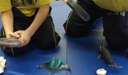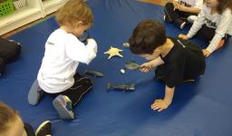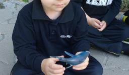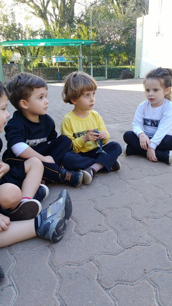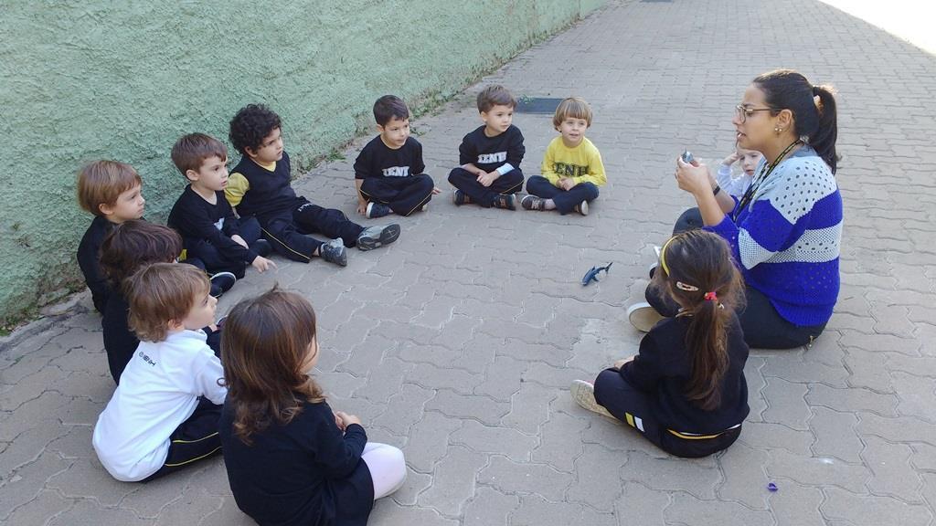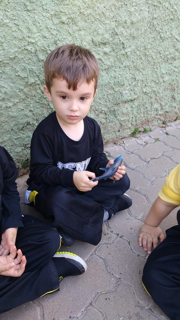 Observando o interesse e a curiosidade dos alunos em relação ao “tubarão”, a Professora Francieli da Silva possibilitou que explorassem e manuseassem tubarões de borracha. Também pesquisaram em um livro ilustrativo sobre este animal e participaram de uma hora do conto com a história “O tubarão resfriado”. “Novamente o interesse e a curiosidade se fizeram presentes e, além disso, estas propostas possibilitaram novas descobertas, visto que aprendemos sobre as partes do corpo do tubarão, descobrimos que os tubarões nunca ficam sem os dentes, vimos por onde os tubarões respiram, como os tubarões enxergam, entre outras curiosidades”, conta a Professora Francieli.