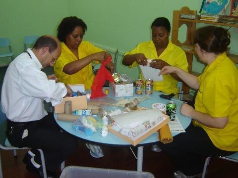 Durante a reflexão, os colaboradores representaram a Visão, Missão, um dos Valores e Princípios da IENH através de teatro, criação de músicas, colagem e montagem com materiais de sucata.