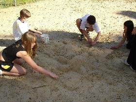 Durante a gincana, os alunos fizeram diversas atividades, como: cabo de guerra, puxar uma “kombi”, escultura na areia, trem cego e monstro de sucata.