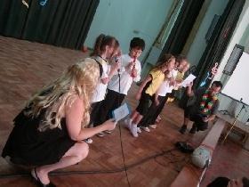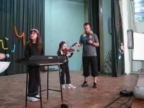 Durante a atividade, os apresentadores chamaram as atrações, que consistiram em danças, músicas, dublagem e instrumentos musicais.