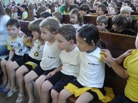 Após, os alunos das 3as séries caminharam até o altar, cantando, e lá colocaram objetos que representavam as coisas pelas quais desejavam agradecer. No altar, os estudantes colocaram em agradecimento “casa”, “bichinhos de pelúcia”, “livros”, entre outros.