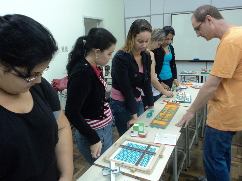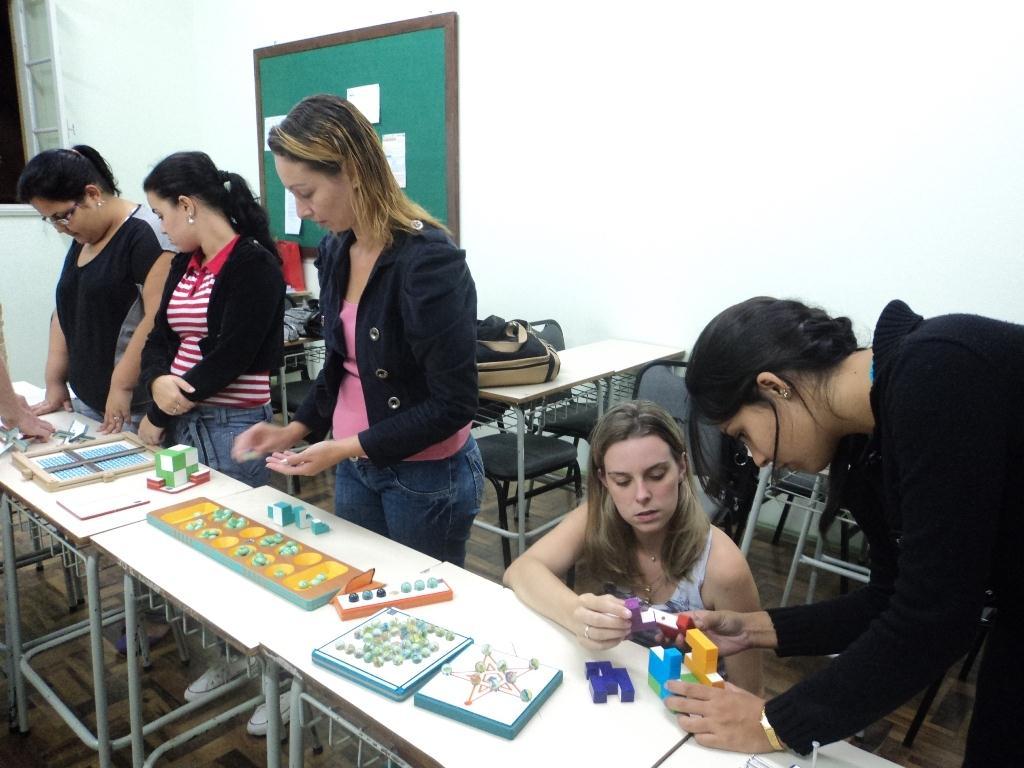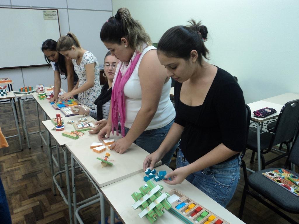 As alunas do Curso Normal – Formação de Professores participaram de uma aula diferenciada de Matemática na noite de 11 de abril. A turma utilizou jogos educativos que possibilitam desenvolver a área da percepção e da cognição nos alunos de diferentes níveis no processo de ensino aprendizagem da Matemática.