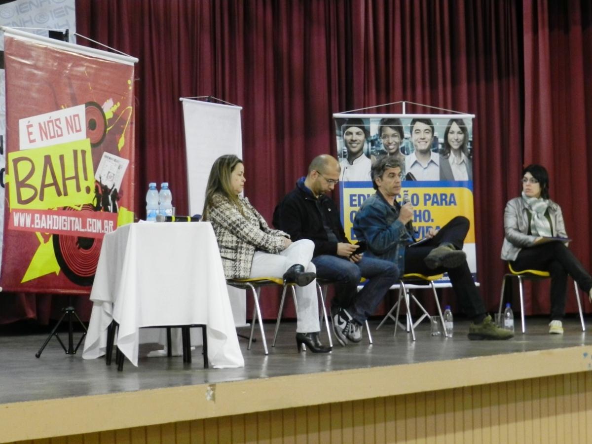 O tema abordado foi Redes Sociais e para discutir o assunto estiveram presentes o Repórter do Jornal NH – Gabriel Guedes, a Professora da Feevale – Christine Bahia e o Design – Marcelo Borba. Gabriela Kasper foi a Mediadora da conversa.
