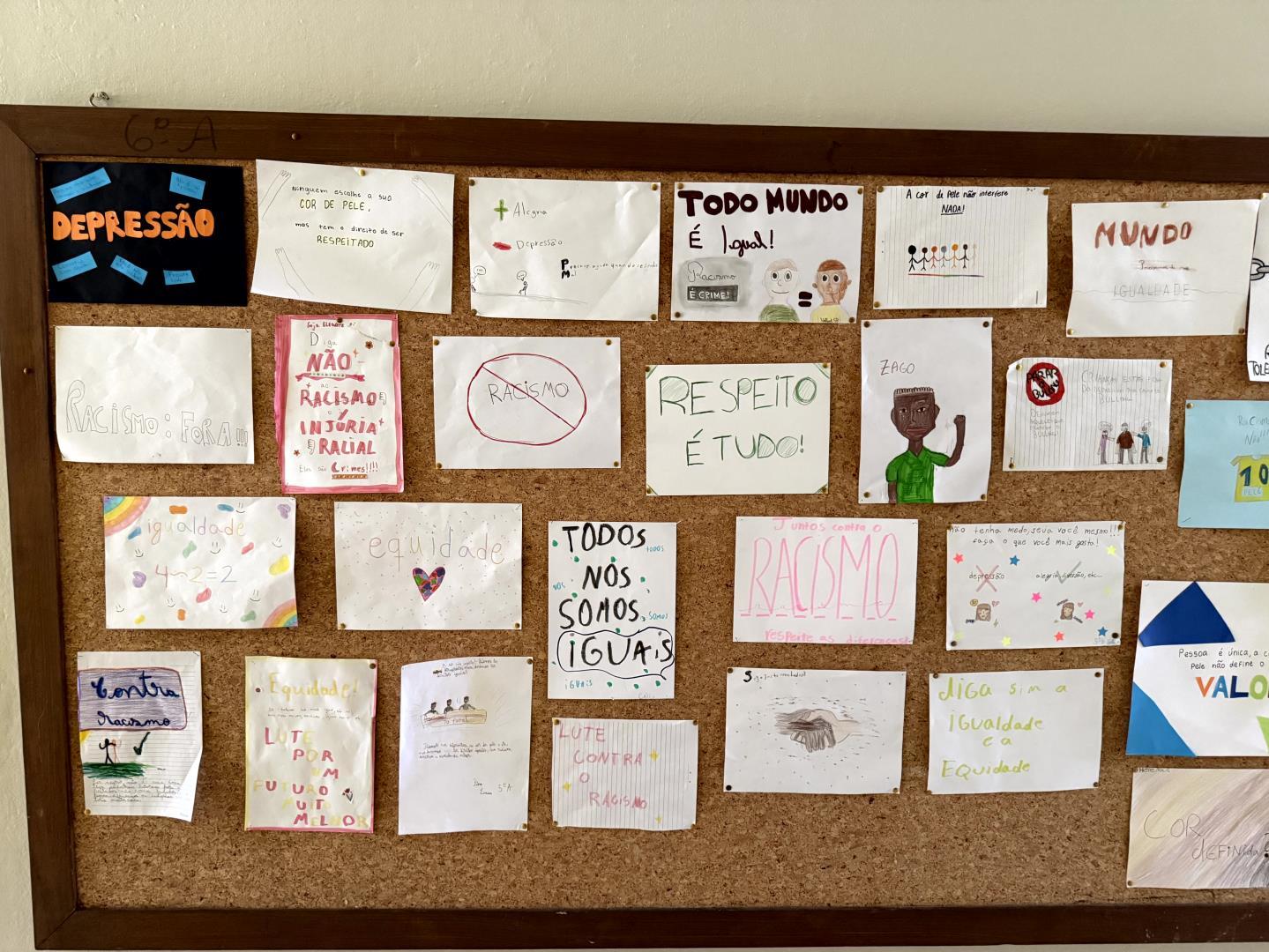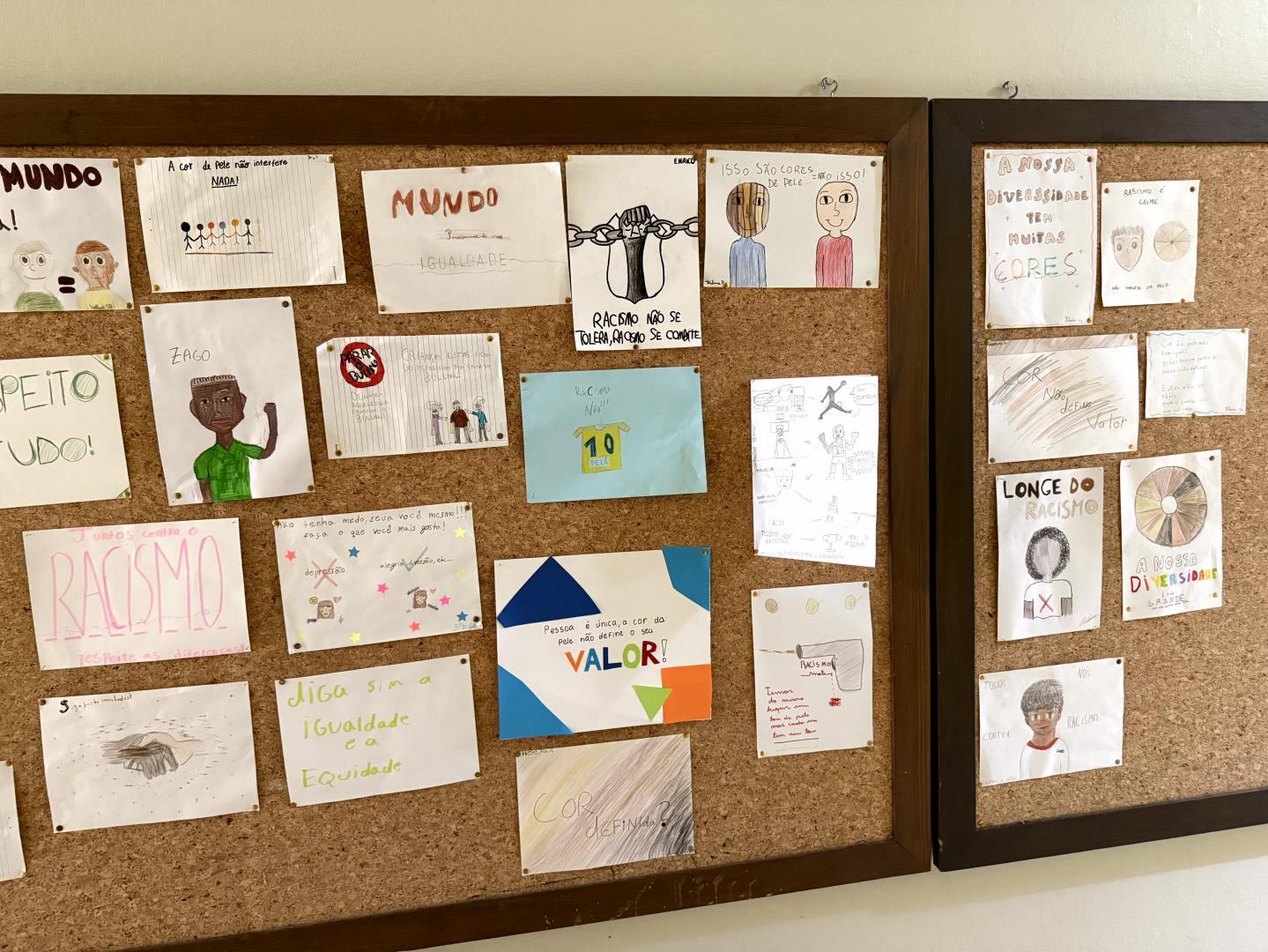 Nas aulas de Língua Portuguesa, a turma produziu cartazes contra o preconceito racial e participou de debates sobre o racismo, destacando a importância da cultura afro-brasileira e da luta do povo negro na história do país.