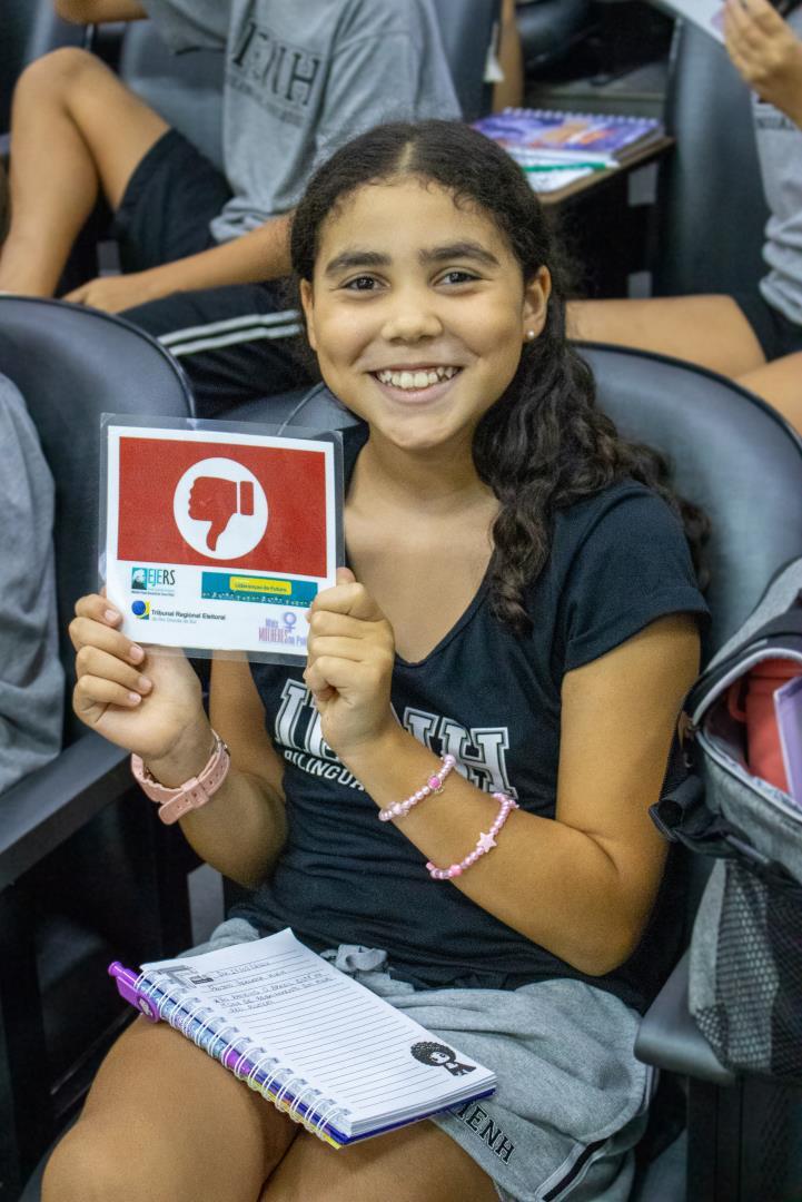 Representando o TRE/RS, Débora Vicente conduziu a palestra “Uma Jornada Mágica nas Eleições Brasileiras”, explicando de forma didática o funcionamento do sistema democrático. Durante a apresentação, abordou a importância da participação política, o funcionamento da urna eletrônica e a necessidade de senso crítico diante das informações, além de chamar atenção para a representatividade feminina na política.