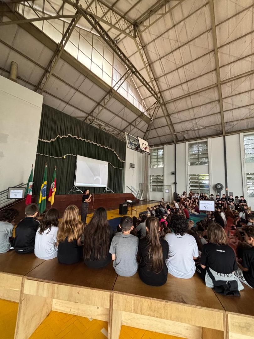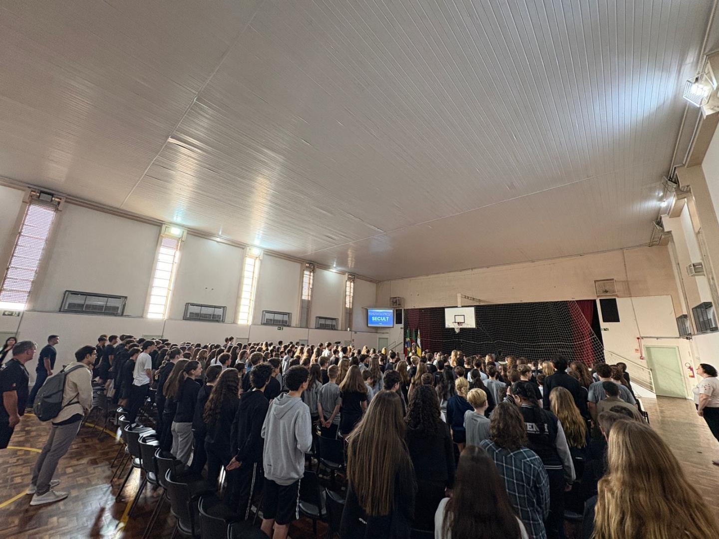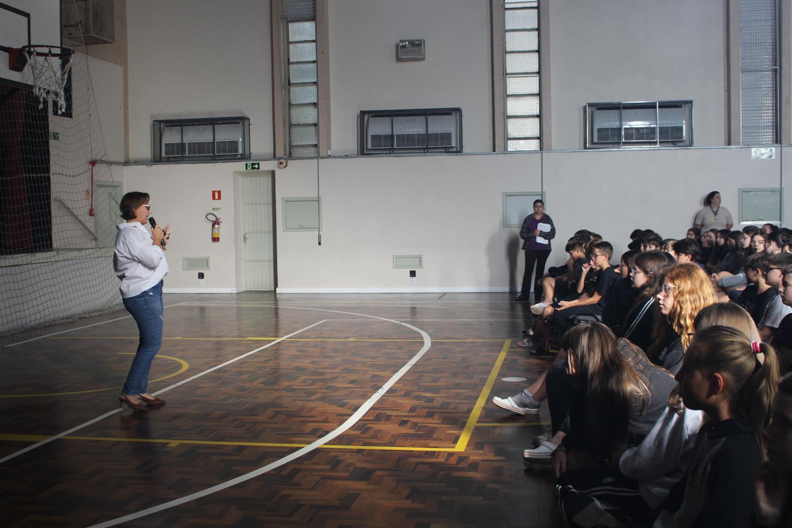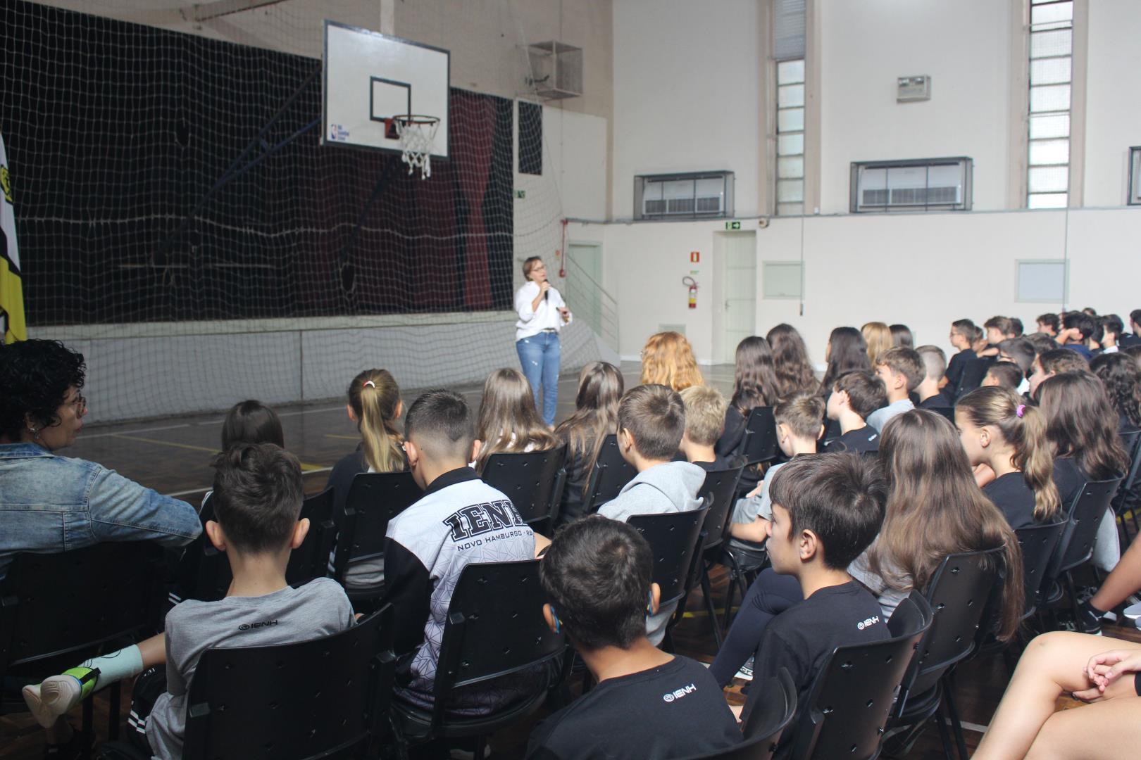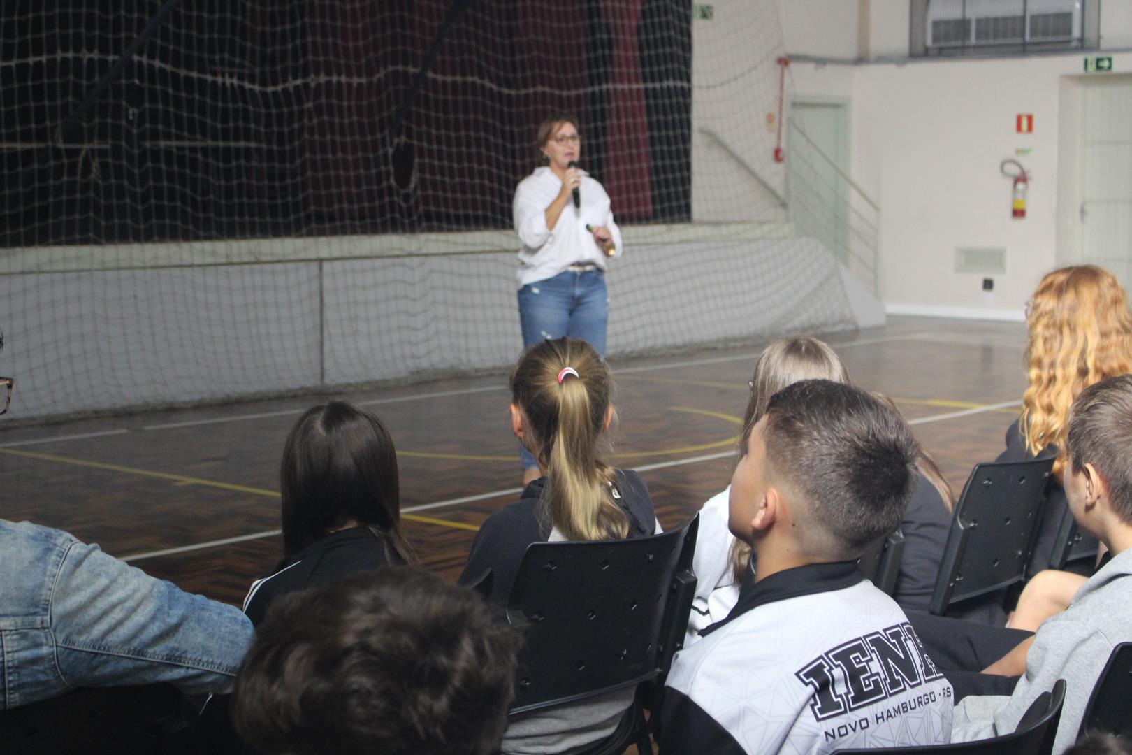 Já na Unidade Fundação Evangélica, a diretora administrativa da Secretaria de Cultura e Turismo de Novo Hamburgo, Amanda Becker, participou da programação com dois momentos no ginásio, voltados aos estudantes do Ensino Fundamental e do Ensino Médio. Durante os encontros, ela compartilhou informações e curiosidades sobre a cidade, destacando o número de praças e as ações desenvolvidas pela Casa das Artes de Novo Hamburgo para a comunidade. Ela também valorizou o museu Dalila Clementina Sperb, personagem histórica relevante na história da IENH, que receberá o acervo do artista Carlão.