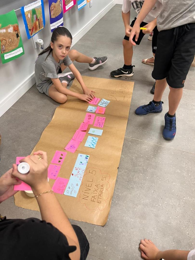 Durante a atividade, as crianças participaram de uma roda de conversa, compartilhando sentimentos, medos e expectativas sobre a nova etapa escolar. Em seguida, construíram coletivamente uma “ponte”, identificando recursos de apoio, como amigos, professores, coragem e a própria capacidade de pedir ajuda, reforçando a percepção de que não precisam enfrentar desafios sozinhos.