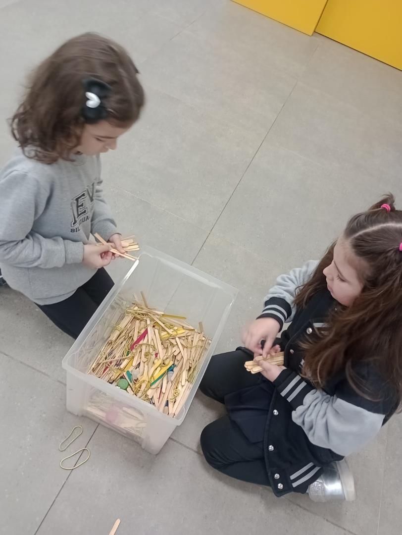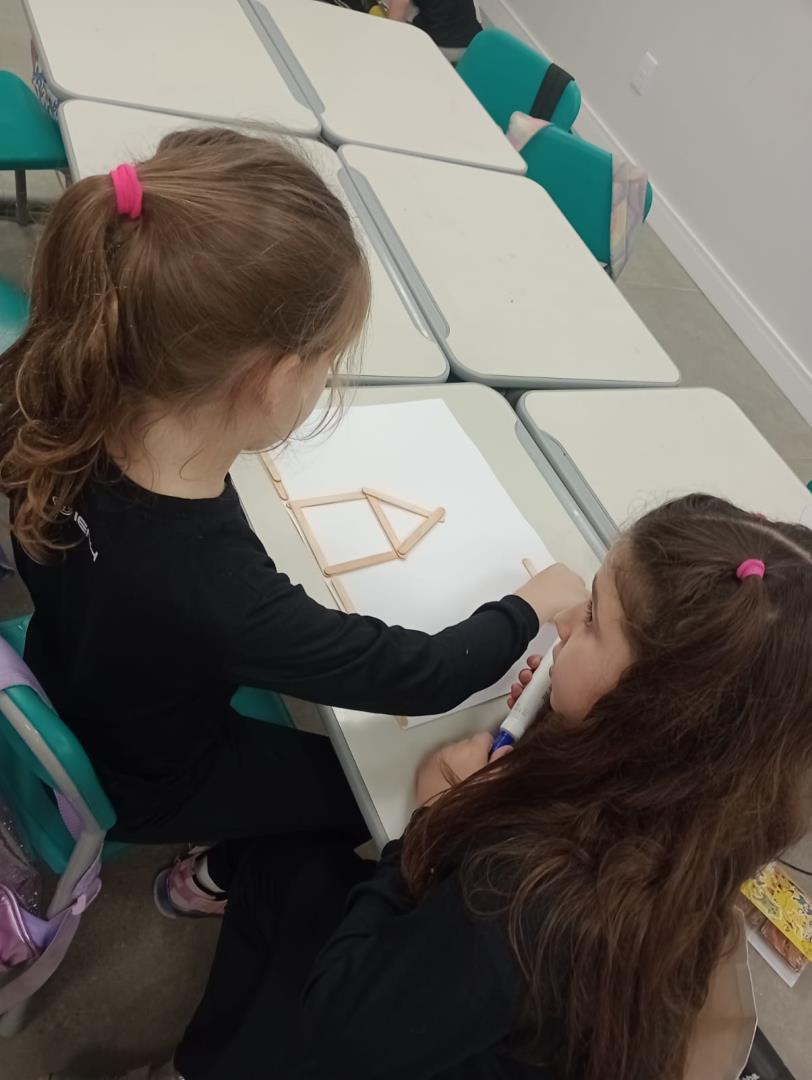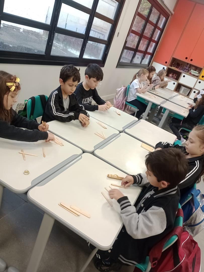 As crianças iniciaram a experiência explorando quantidades por meio de palitos, realizando contagens e combinações. Depois, foram desafiadas a criar figuras utilizando exatamente 10 palitos, exercitando a criatividade e a organização espacial.